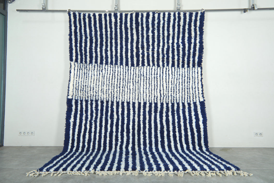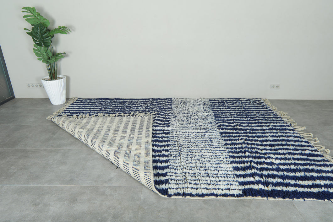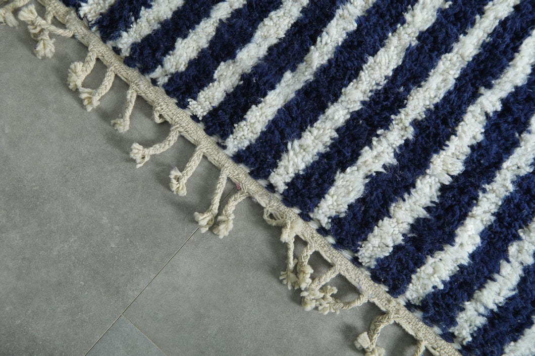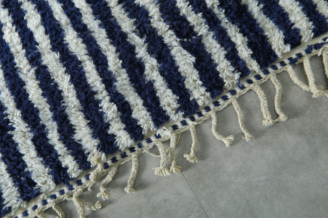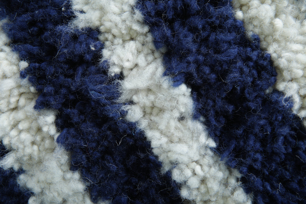 The CTM818-B custom Moroccan rug is a striking blend of bold design and luxurious craftsmanship. Handwoven by skilled Moroccan artisans, this high-pile wool rug features a dynamic navy-and-ivory striped pattern that creates a strong visual rhythm while remaining timeless and versatile.
