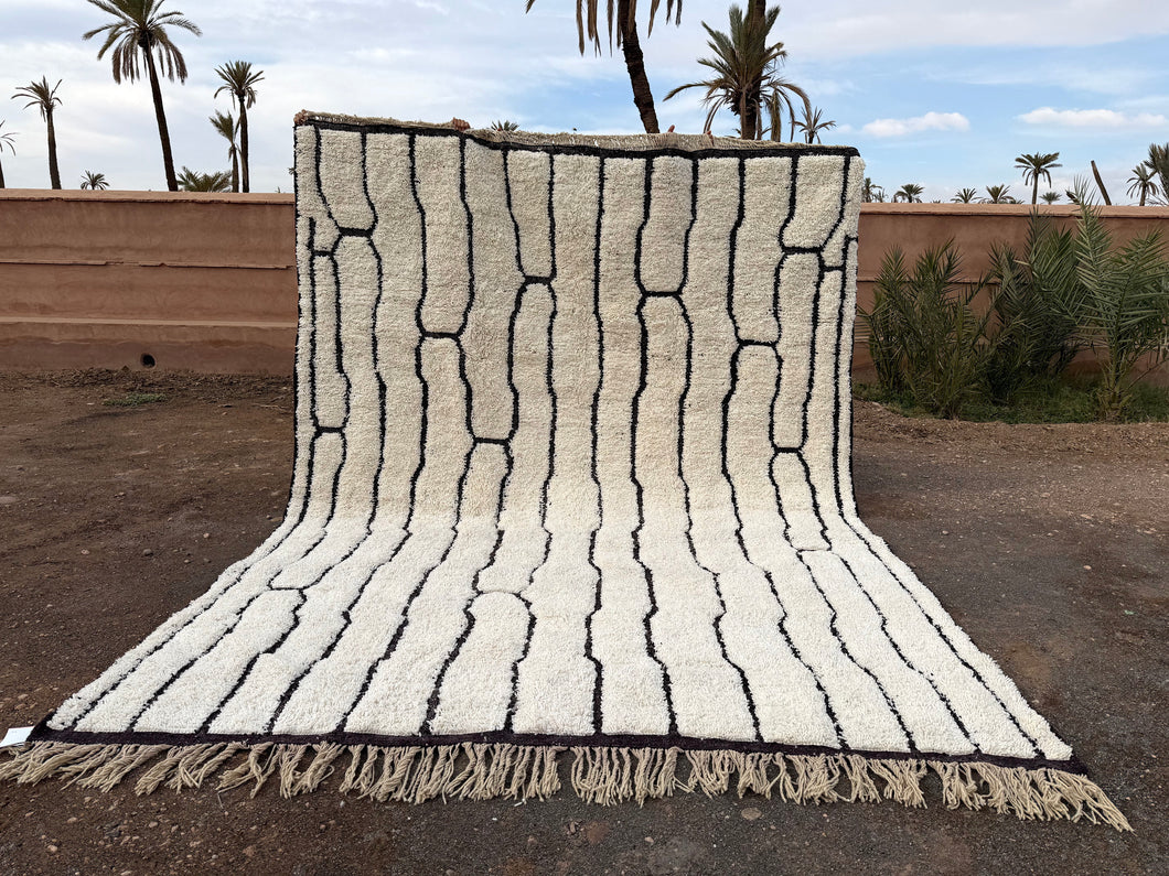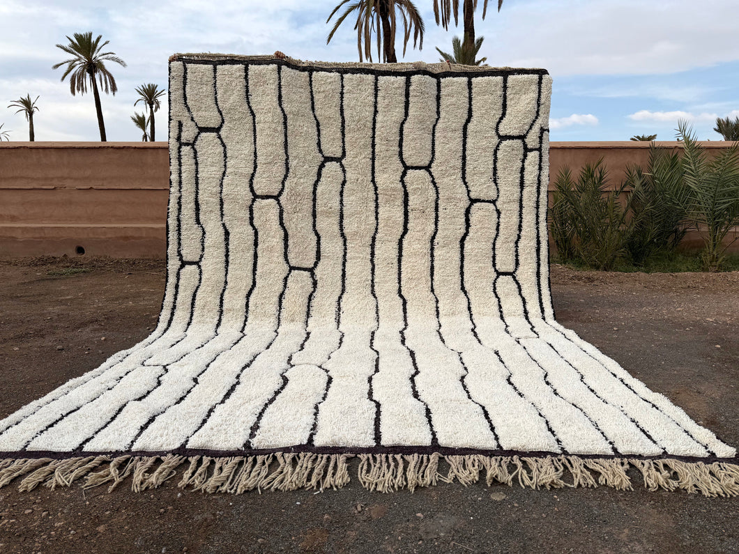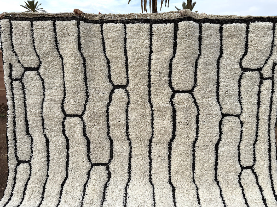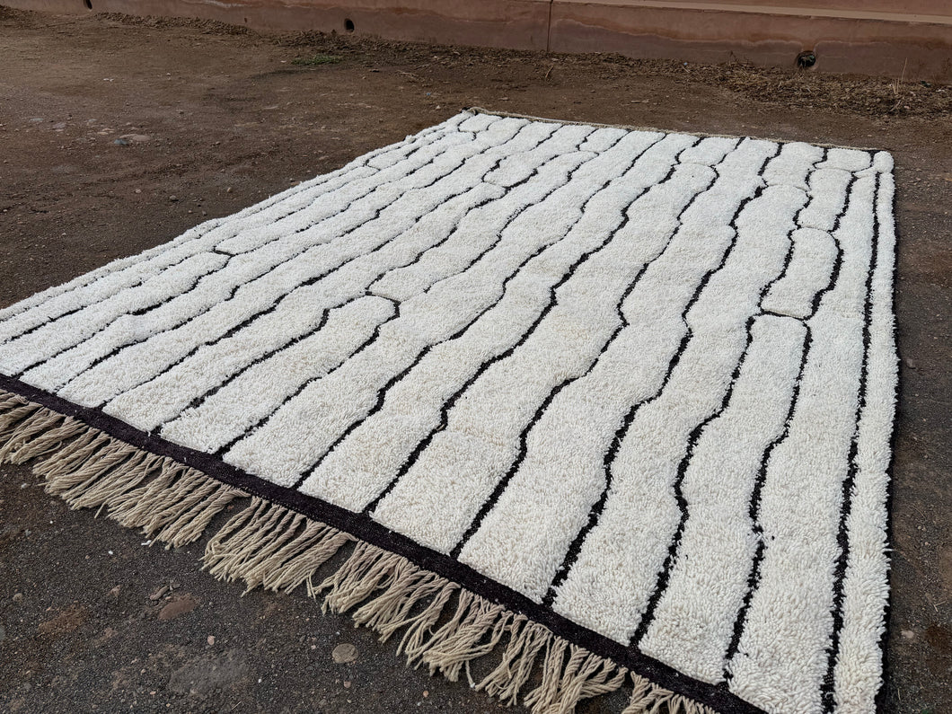 Abstract White Moroccan Rug – Handmade Beni Ourain Design Elevate your space with this striking abstract white Moroccan rug, a contemporary interpretation of traditional Beni Ourain craftsmanship. Hand-woven by skilled Berber artisans using premium natural wool, this piece features bold black geometric lines that add modern sophistication to any room. The neutral palette and minimalist design complement both eclectic and refined interiors, while the durable wool construction ensures lasting beauty. Available in custom sizes to fit your exact specifications. Free shipping included. A timeless investment in authentic Moroccan heritage and artisanal quality.