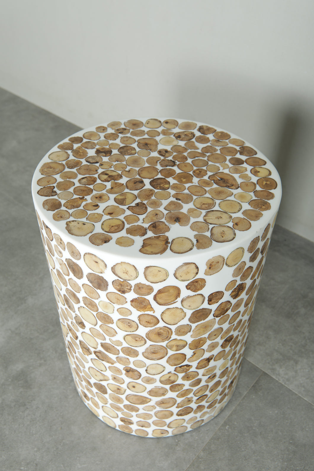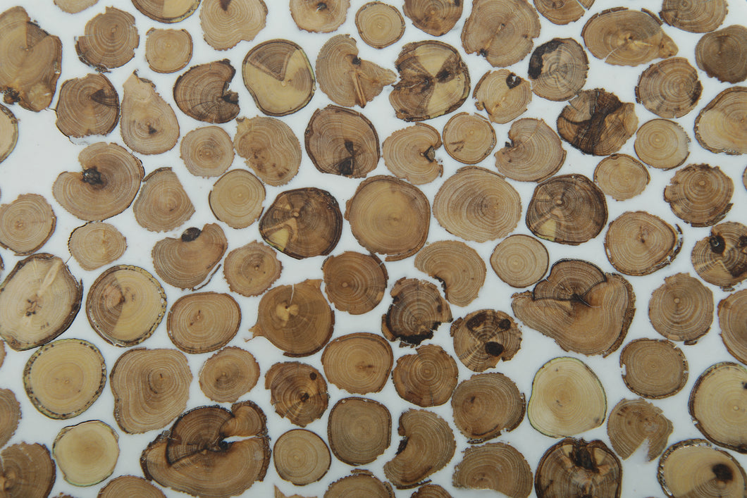 • Finish: Dark, earthy tones with natural wood slice patterns