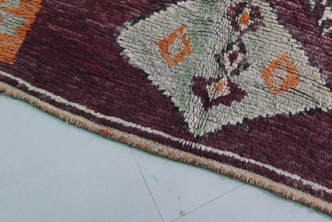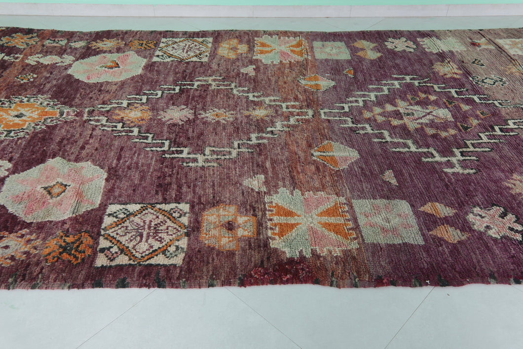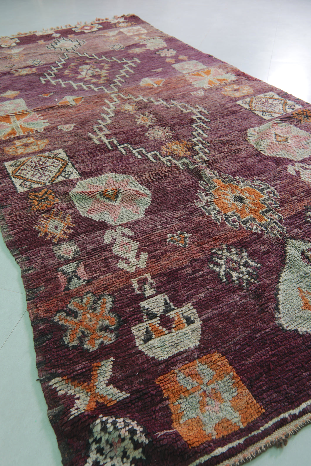 This vintage Moroccan rug, measuring 5.9 x 12.4 feet, is a 100% handmade Berber wool runner showcasing deep plum hues. Crafted entirely from wool, it combines traditional Moroccan artistry with durable materials, adding rich color and texture to any hallway or living space. Its authentic craftsmanship and bold design make it a striking focal point, perfect for enhancing your home with timeless vintage charm and cultural heritage.
