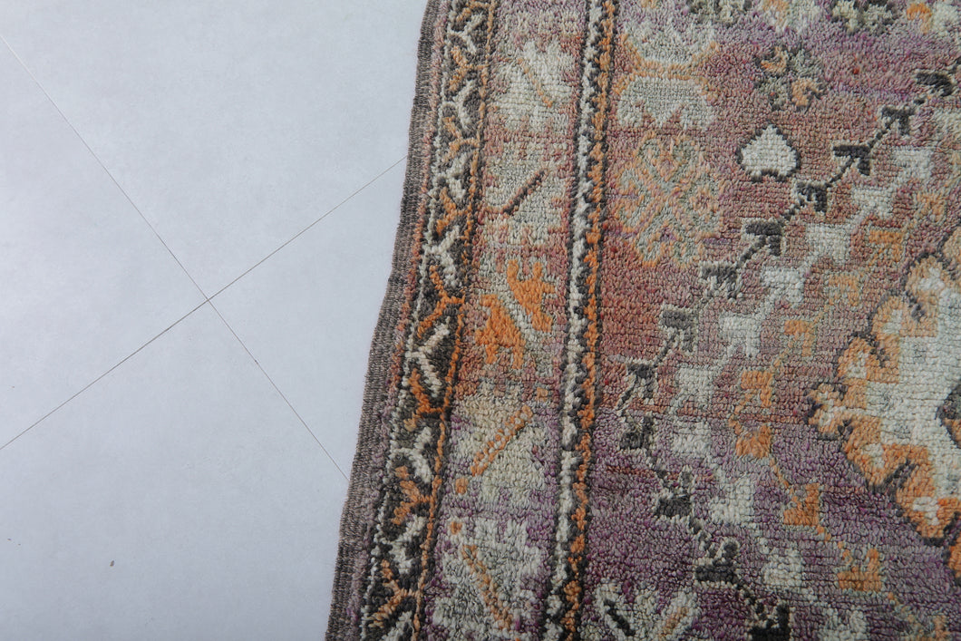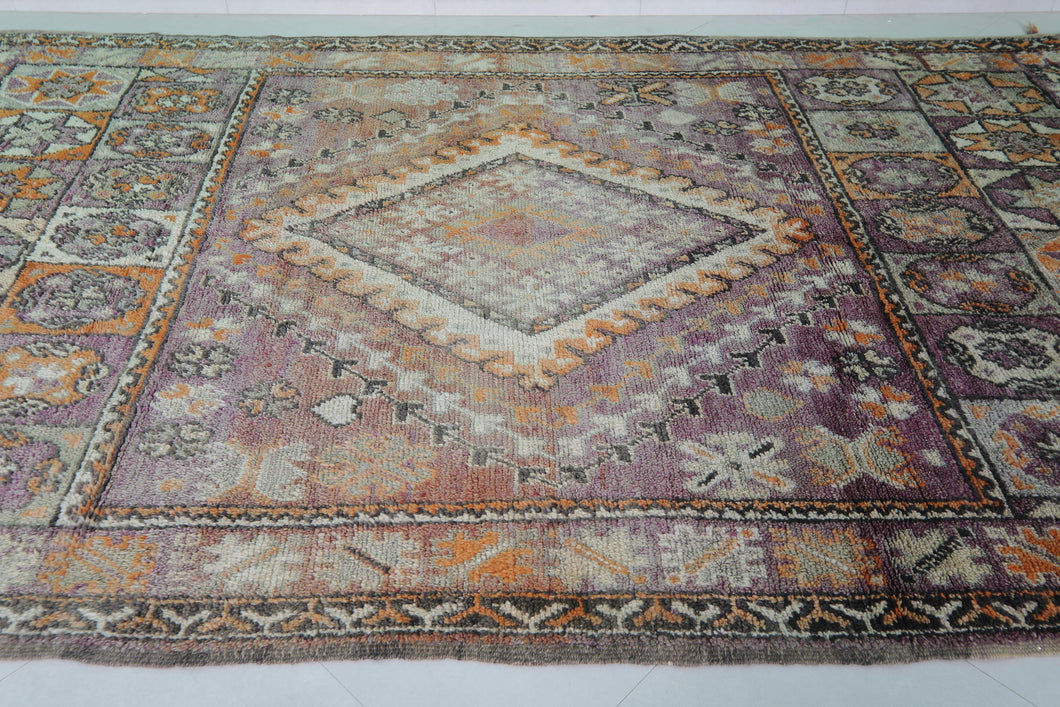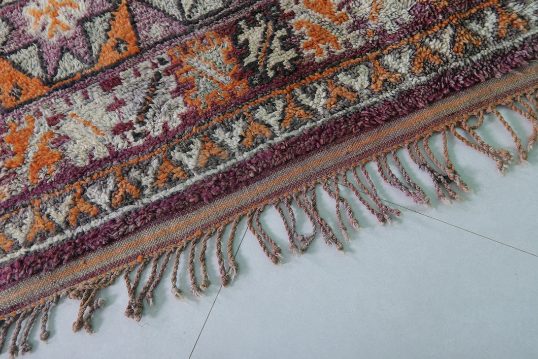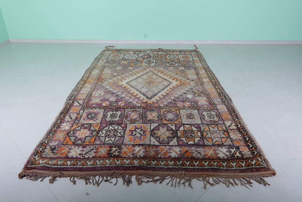 Crafted with traditional techniques and artistic spirit, this vintage Moroccan rug tells a story in every thread. Woven by skilled Berber artisans, it showcases a central diamond medallion surrounded by intricate geometric motifs, framed by elaborate multicolor borders featuring eight-pointed stars, tribal icons, and stylized florals.