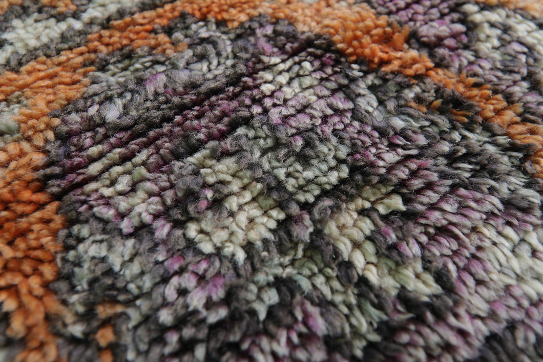The warm lavender-lilac base is elegantly contrasted with saffron, soft white, charcoal, and burnt orange tones—creating a unique harmony between bold and muted. This large handmade wool rug is ideal for anchoring open-concept living spaces, bohemian lounges, creative studios, or elegant bedrooms.