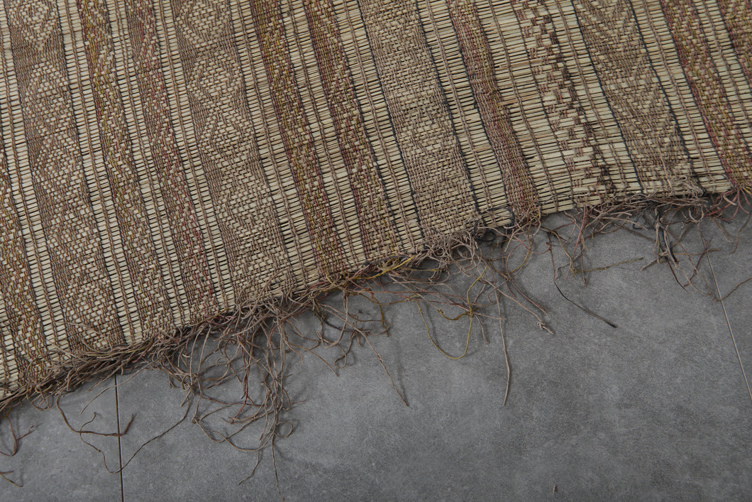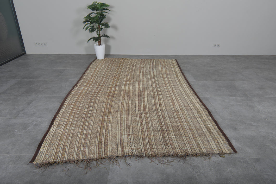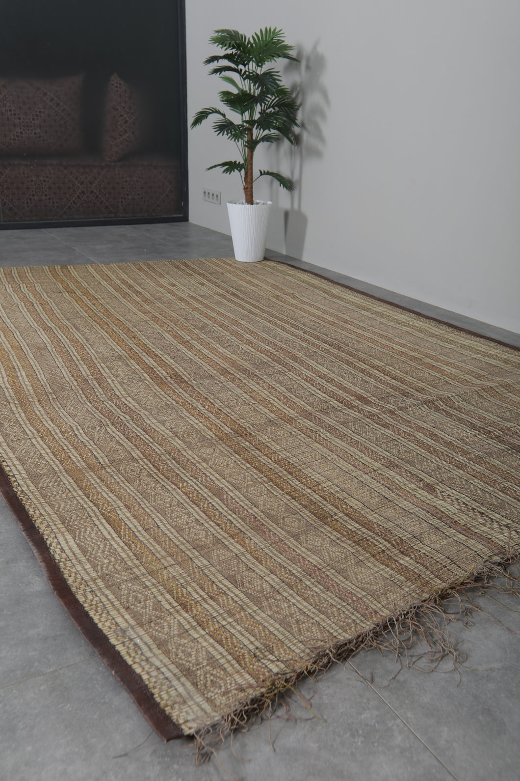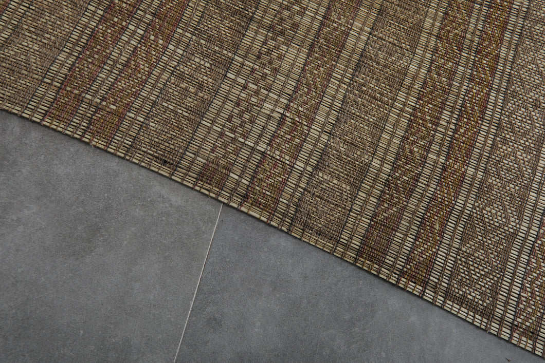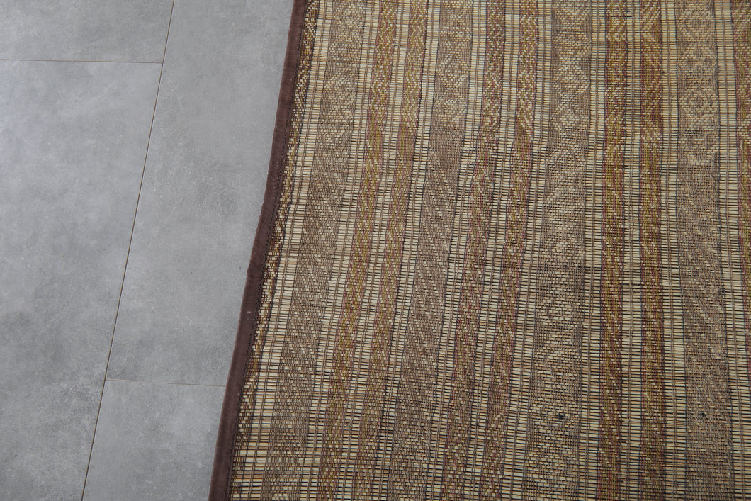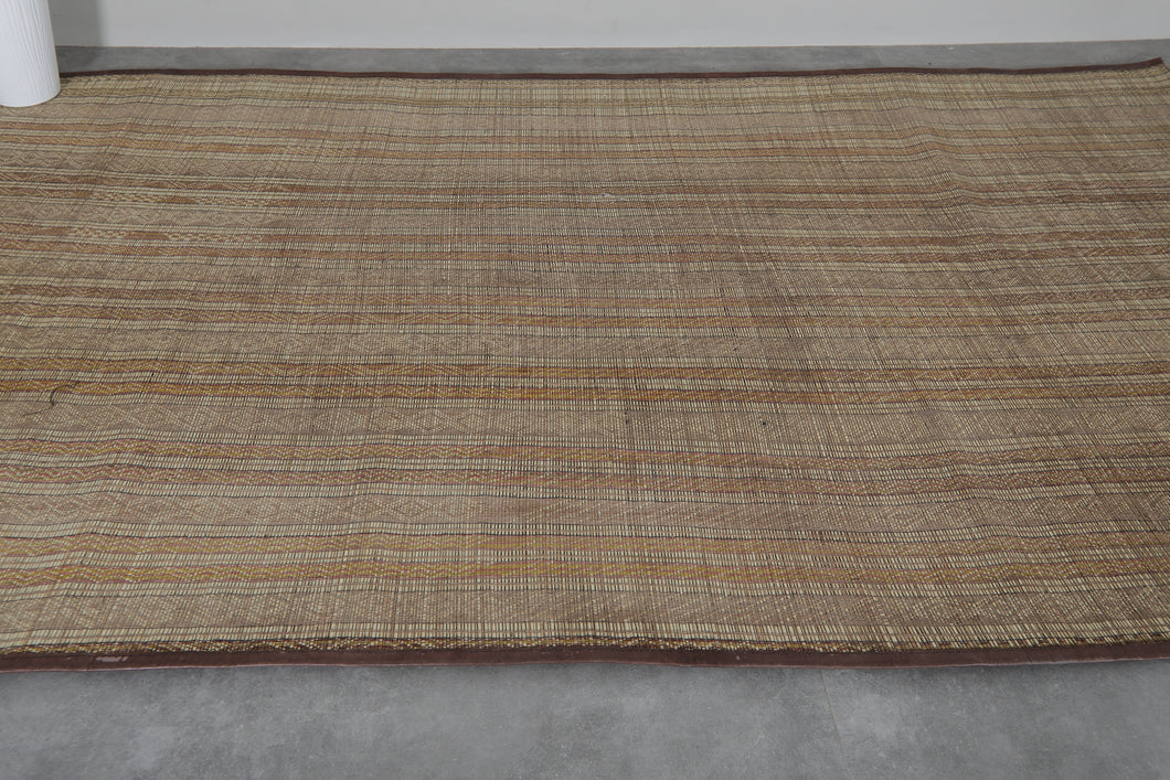 Infuse your home with warmth and heritage through this vintage Tuareg mat, handmade from palm reed and handwoven leather by nomads of the Sahara. The soft neutral tones of sand beige, worn umber, and pale cinnamon are arranged in vertical lines with intricate Berber symbols faintly etched in the weave. A timeless piece of African craftsmanship, this Tuareg rug complements minimalist, earthy, or ethnic interiors. Each line tells a silent story of desert journeys and nomadic life—making it not just a rug, but a piece of living tradition.