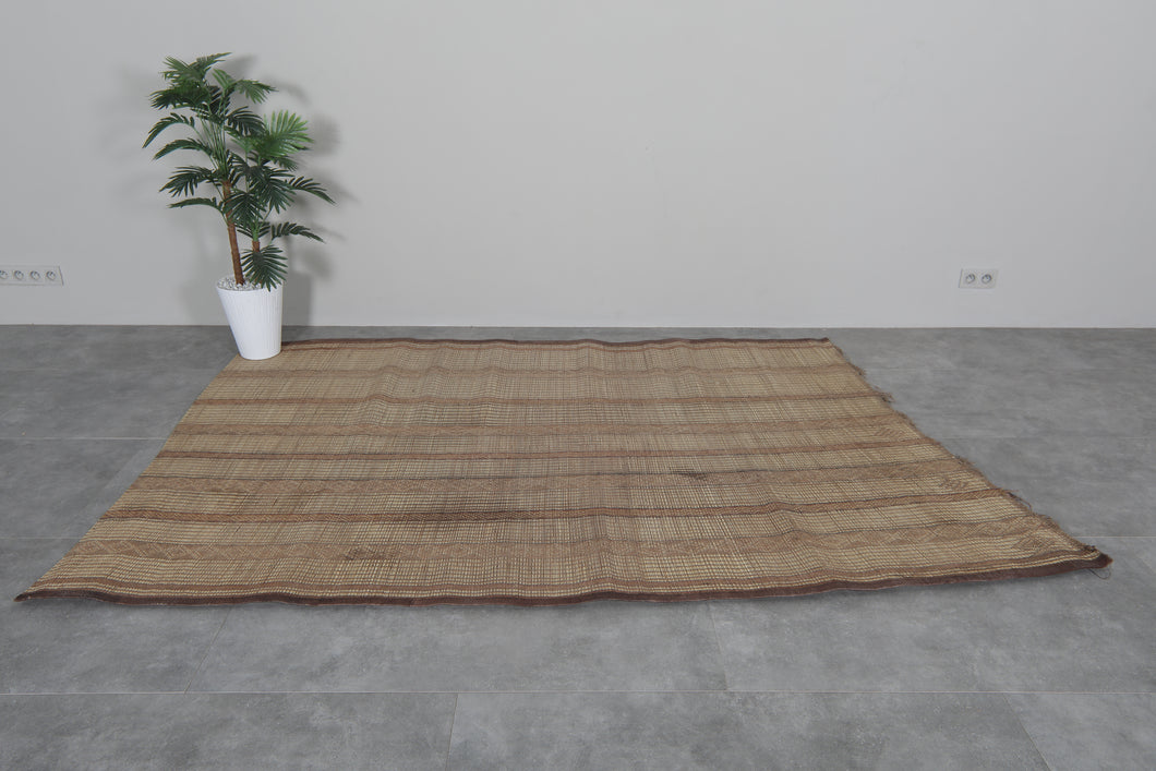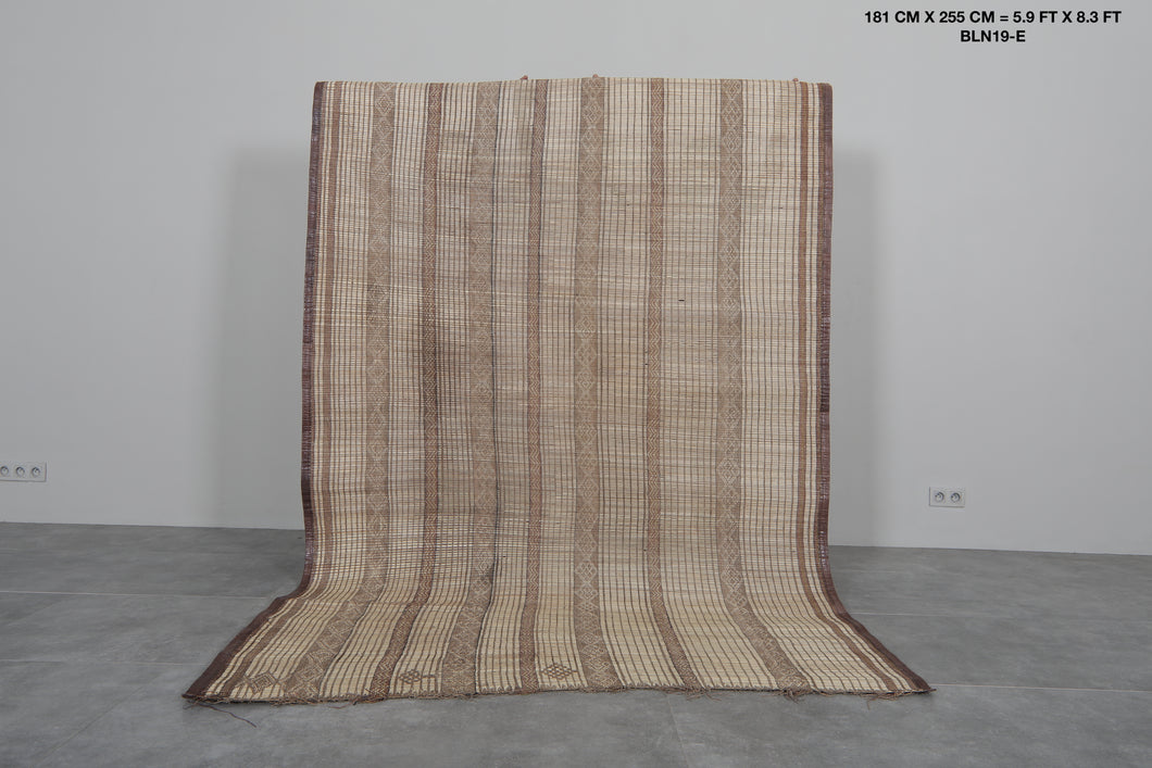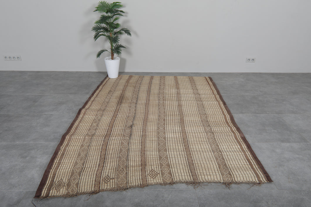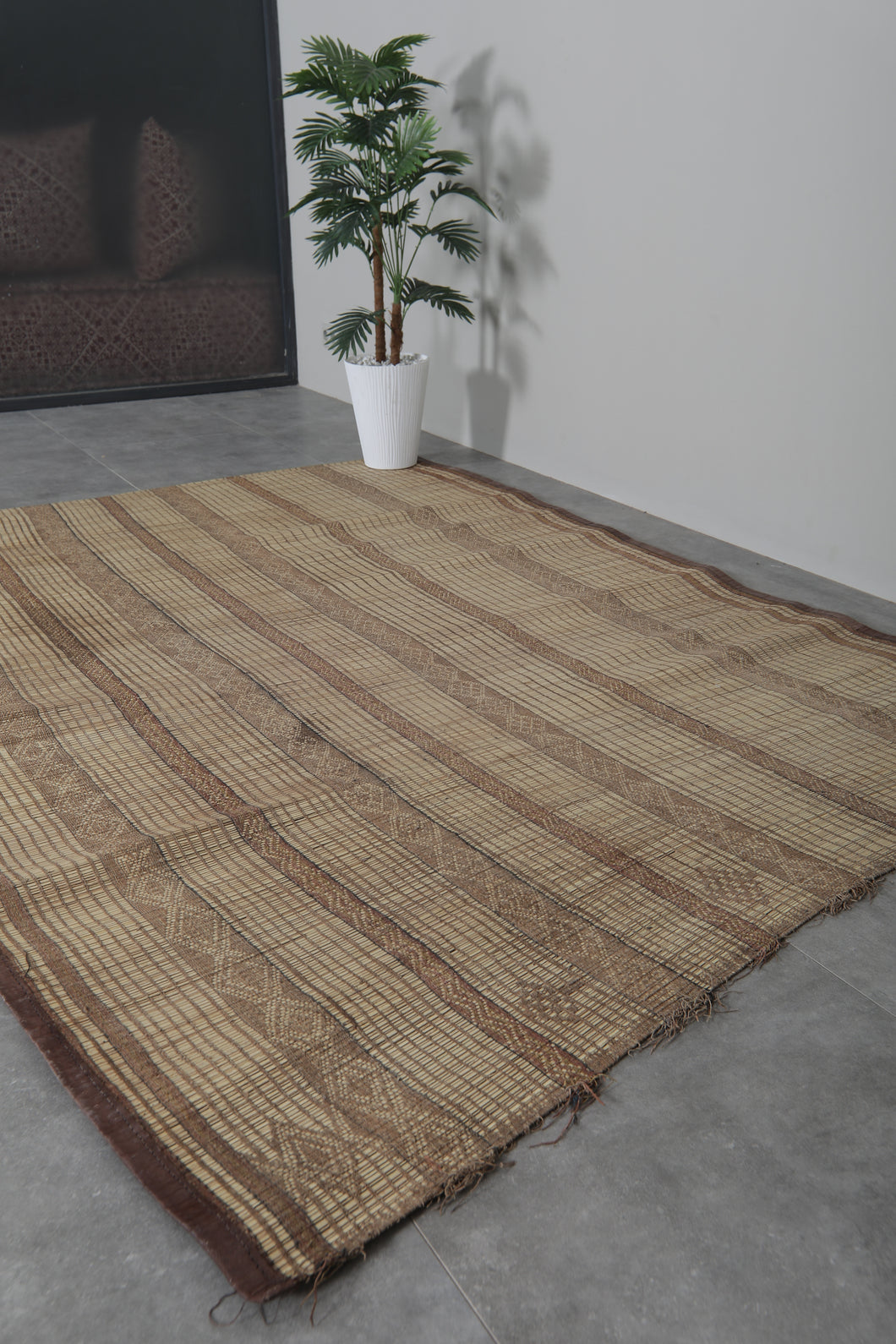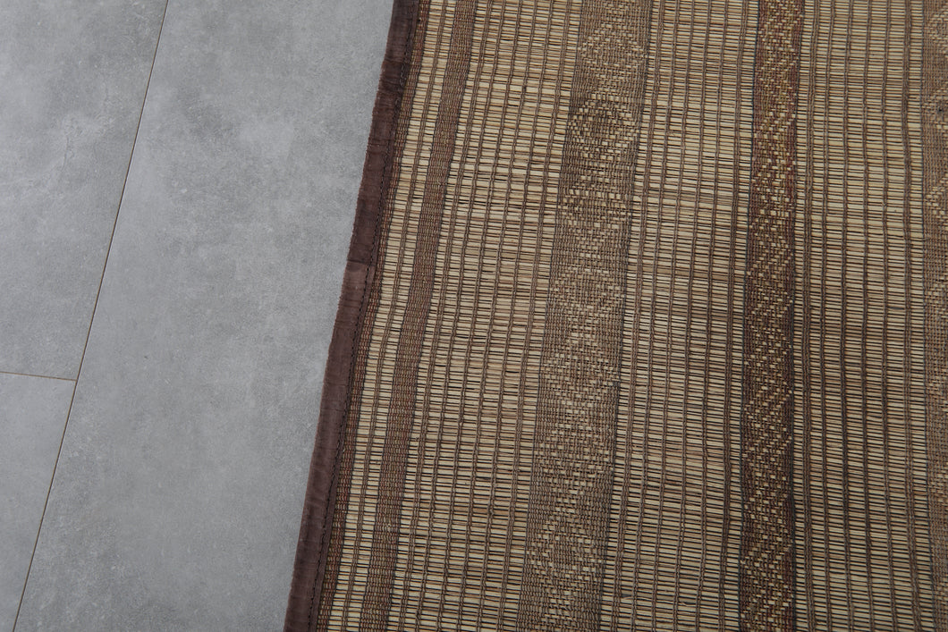 Add authentic nomadic elegance to your home with this vintage Tuareg mat from Mauritania, handwoven from natural reed and leather strands. With its calm earth-toned palette and geometric tribal bands, this mat reflects the ancient heritage of the Sahara. The soft brown and beige hues offer a neutral foundation that blends seamlessly into minimalist, rustic, or boho interiors. Each pattern strip is meticulously embroidered using dyed leather strips in traditional symbols, forming a narrative passed down through generations of Tuareg artisans. Both functional and decorative, this mat is perfect for large entryways, under a dining table, or styled as wall art.