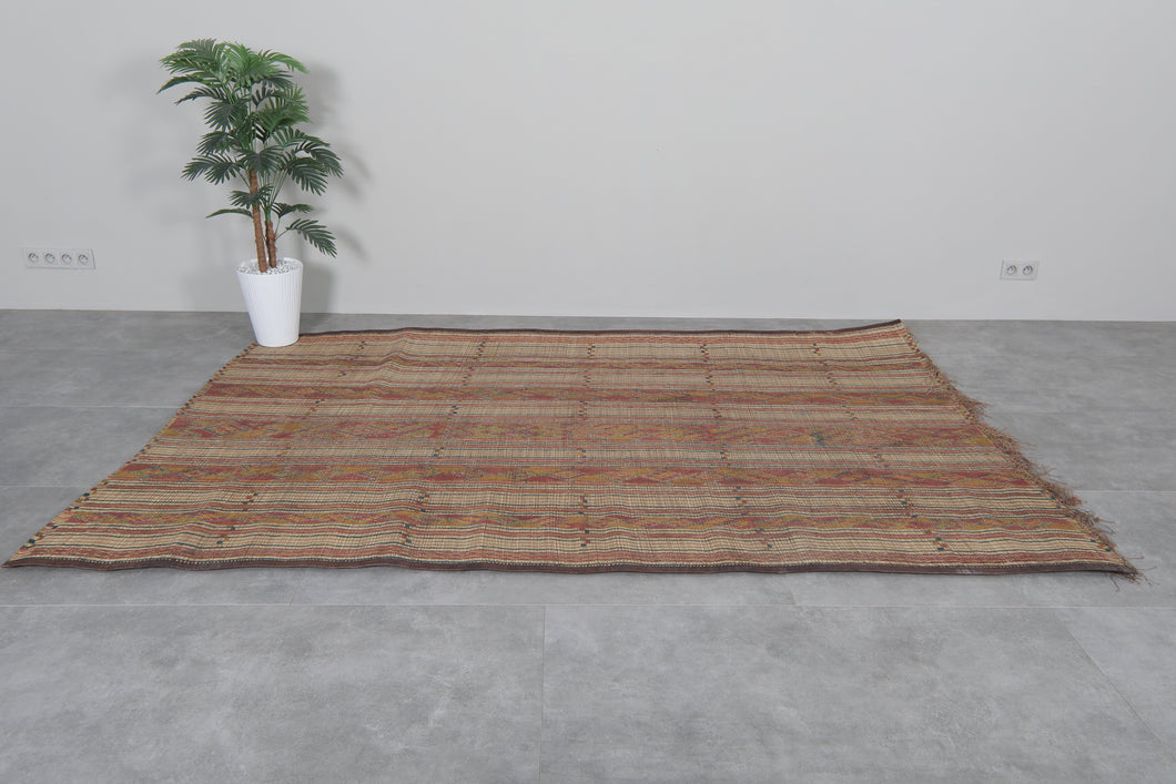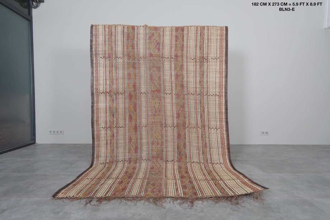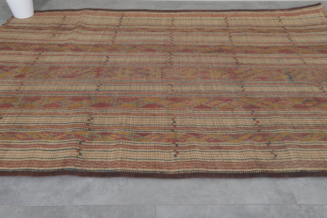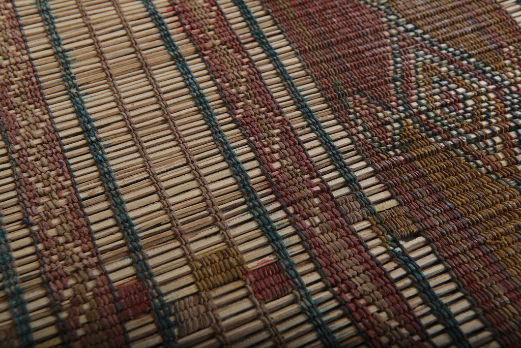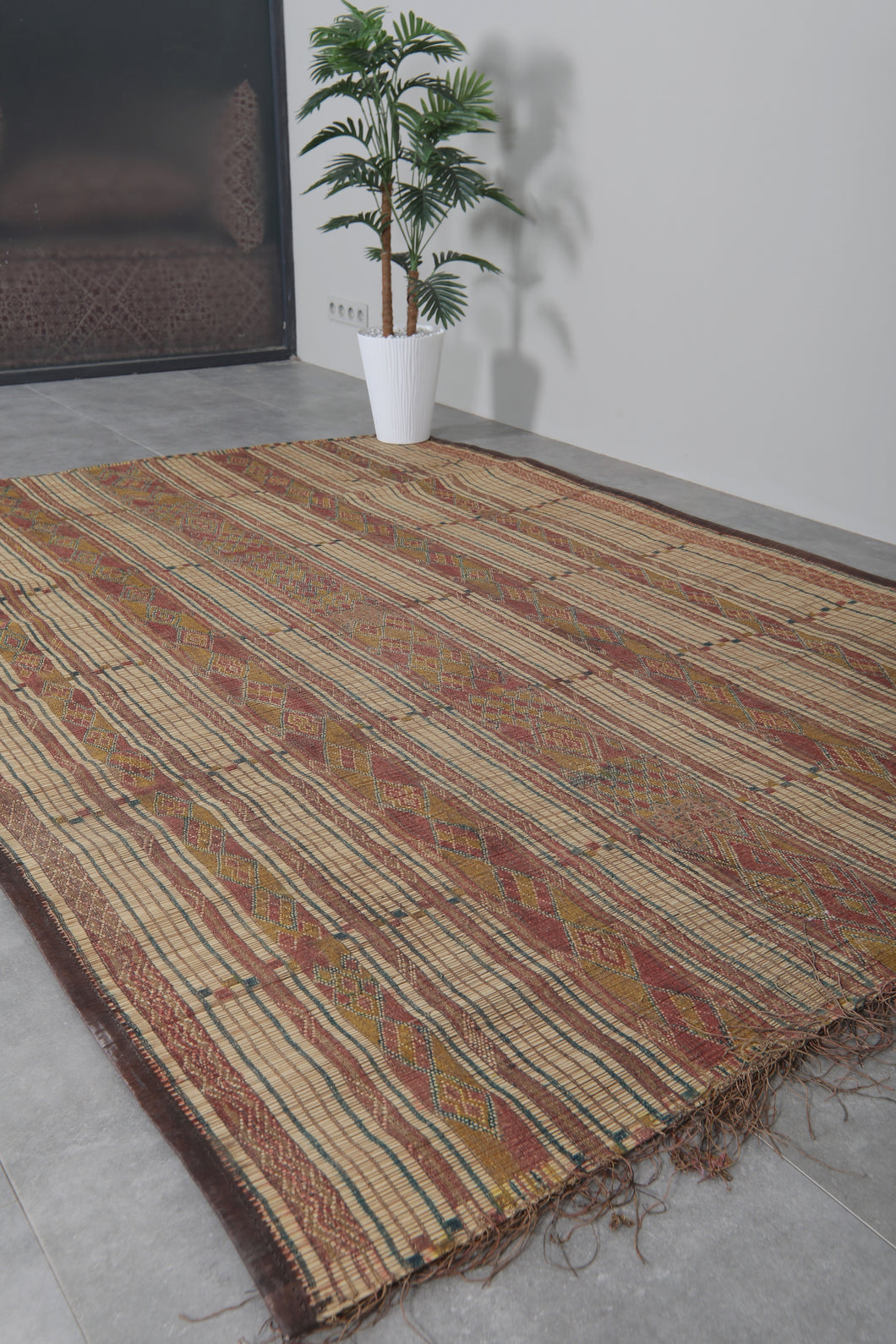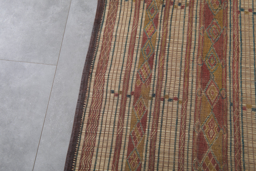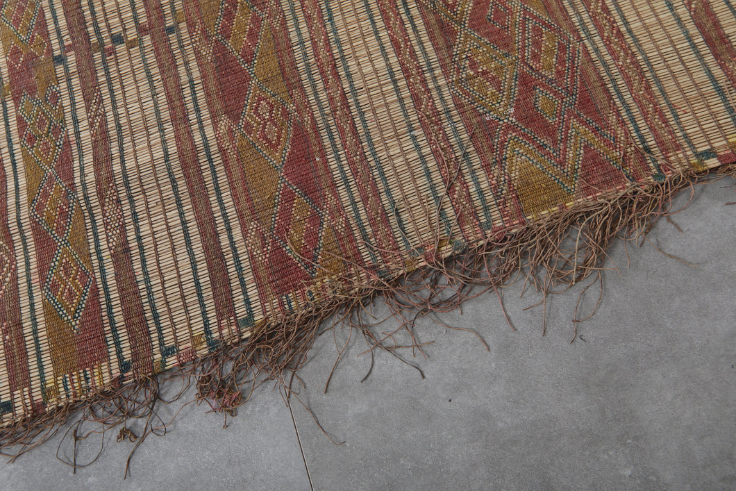 Elevate your space with this striking vintage Tuareg mat, handcrafted by nomadic artisans from the Mauritania Sahara. Woven using reed palm fibers and embellished with rich hand-stitched leatherwork, it tells the story of a proud Berber tradition. The layout features vertical columns of intricate diamond motifs in ochre, terracotta, and earthy reds—set against a neutral reed base for high contrast and visual rhythm. It’s a bold cultural statement that brings warmth and history into any space, from modern boho interiors to rustic living rooms.