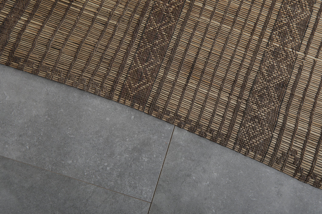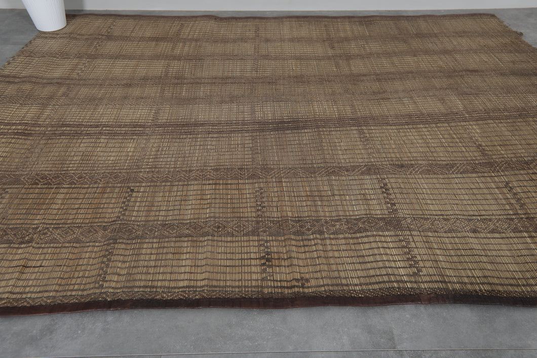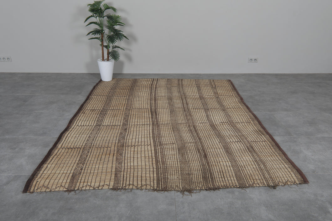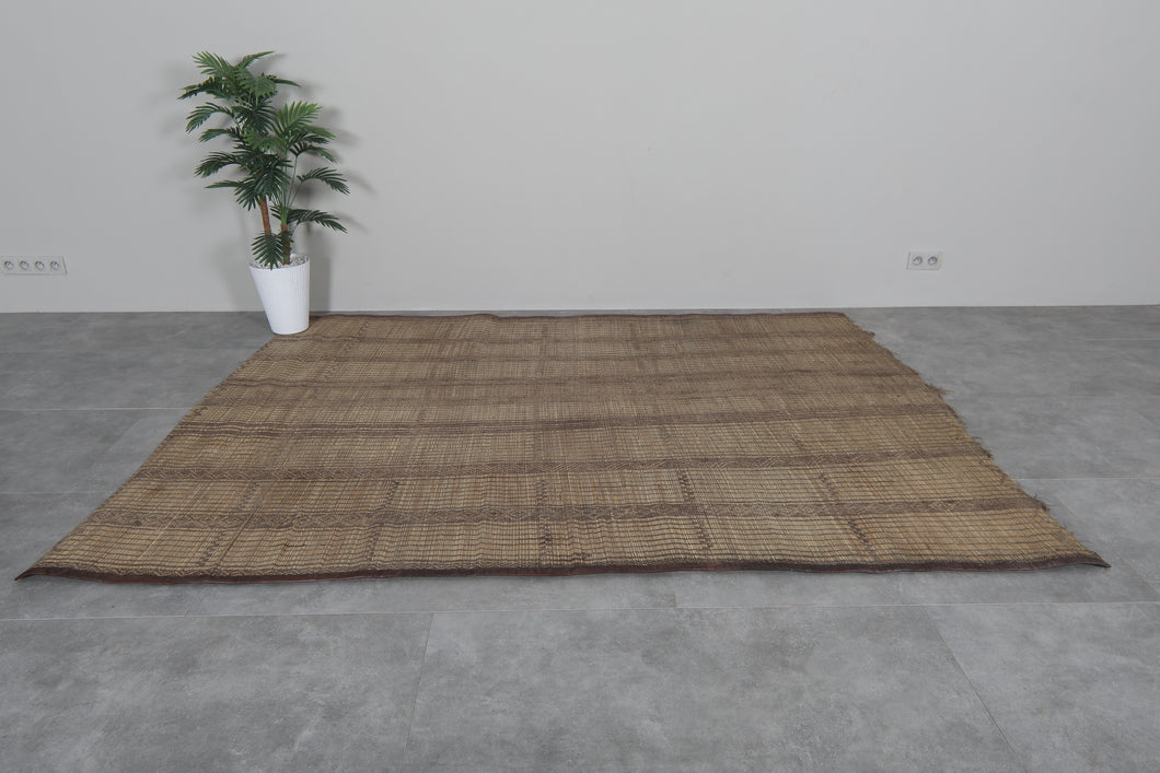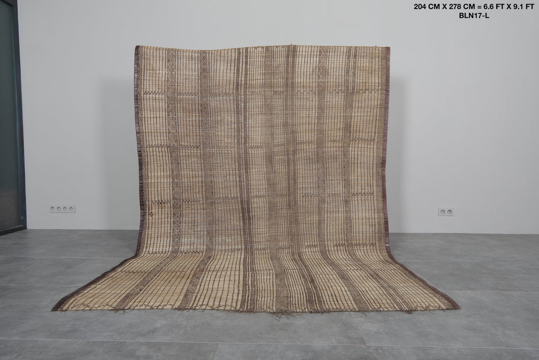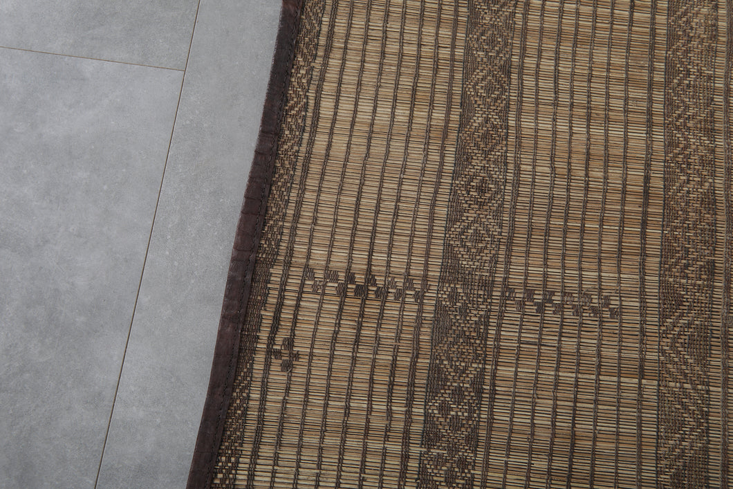 Elevate your home with the earthy spirit of the Sahara. This handmade Tuareg mat is crafted from natural reed and intricate leather strips by nomadic Tuareg artisans of Mauritania. Its symmetrical vertical bands, etched with tribal motifs and subtle square formations, reflect the geometric language of Berber design. The warm palette of sun aged brown, muted sand, and deep walnut tones adds organic elegance to any interior—perfect for grounding minimalist spaces, rustic homes, or gallery-like settings. A rare, collectible piece that carries tradition, utility, and understated beauty.