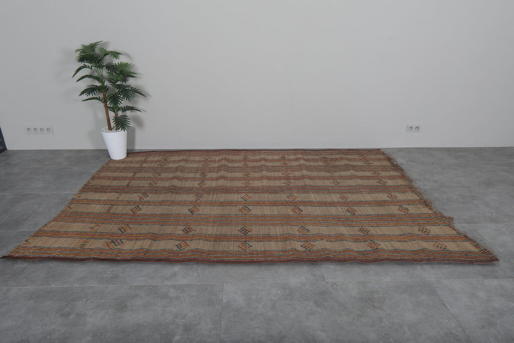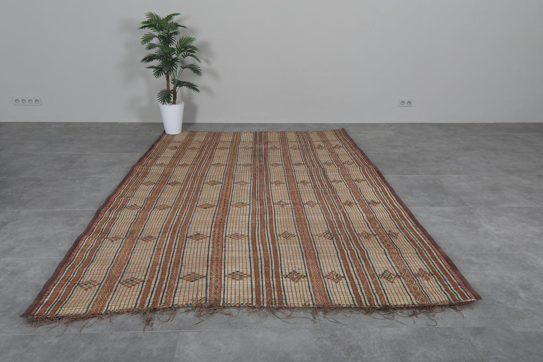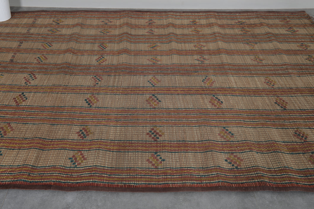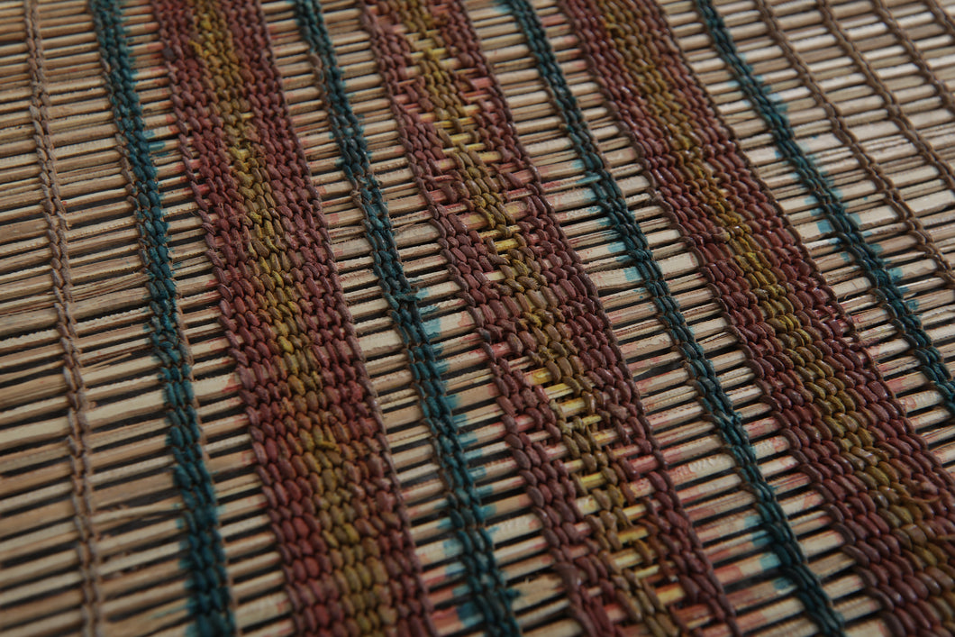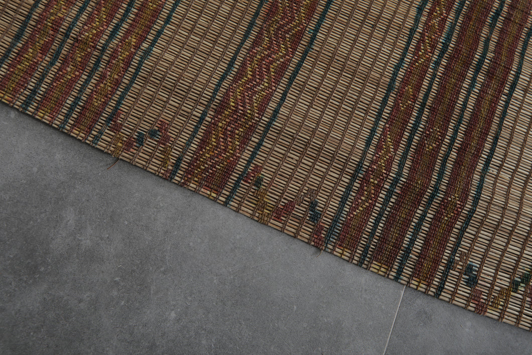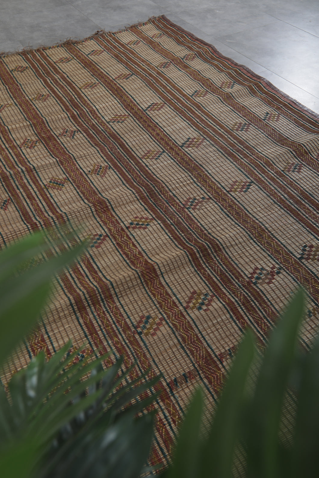 Bring home the spirit of the Sahara with this extraordinary vintage Tuareg mat, handmade in Mauritania. Each reed is tightly woven and interlaced with strips of leather, forming bold vertical bands and rare embroidered diamond motifs. The tiny multicolor stitches throughout the pattern are a unique feature—representing symbols of protection and identity among Tuareg nomads. Earthy shades of terracotta, camel, and walnut blend with subtle accents of green, saffron, and charcoal, creating a mat that feels both grounded and decorative. Use it as a statement rug, wall piece, or cultural heirloom.
