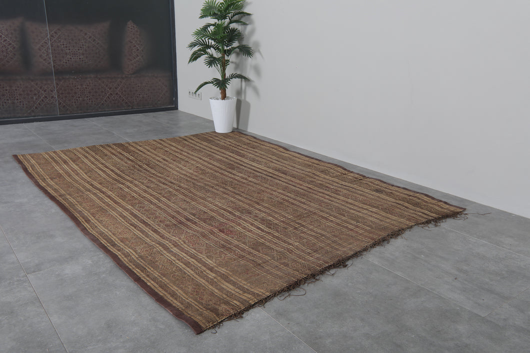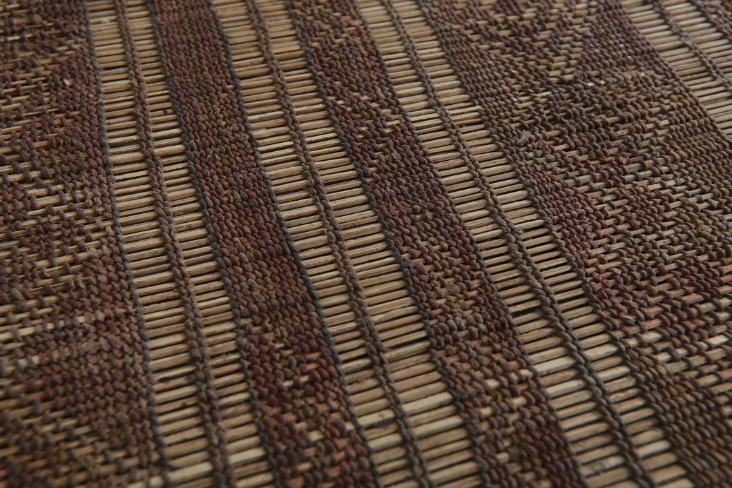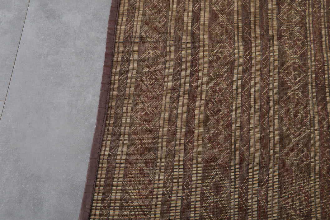 Elevate your space with this authentic Tuareg mat, handwoven by Saharan nomads using palm reed and strips of leather. The deep burnt sienna and soft clay tones create a grounded, tribal presence, while the central band is rich with intricate Berber motifs and symbolic diamond patterns. This vintage African mat is not only a practical floor piece, but a stunning collector’s item that brings desert heritage and artisanal charm into any interior.