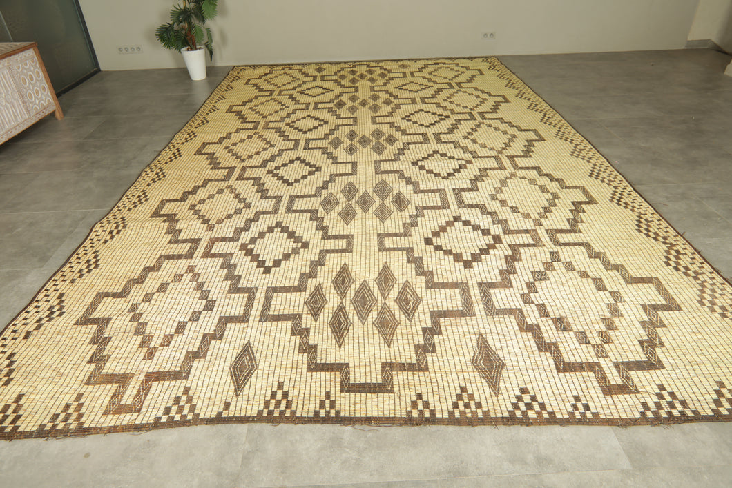Bring artisan heritage and visual impact to your space with this stunning Tuareg Rug, handwoven by nomadic artisans of the Sahara. Crafted from natural palm reed and leather, the rug showcases an intricate layout of bold diamond motifs and stepped tribal forms in rich brown tones over a warm beige background.