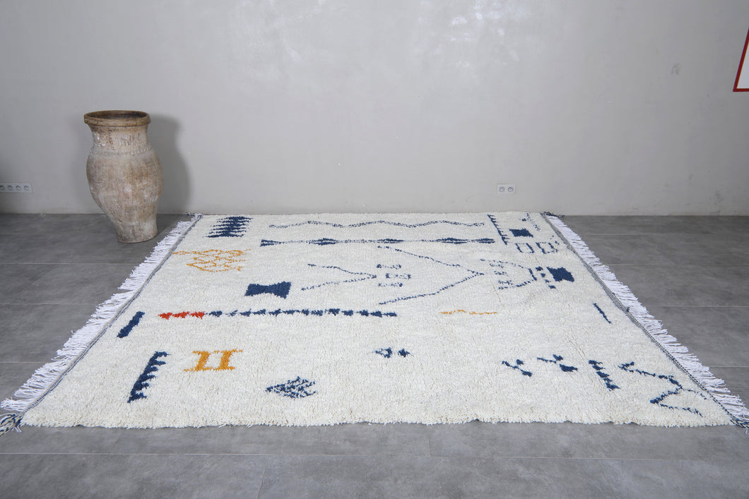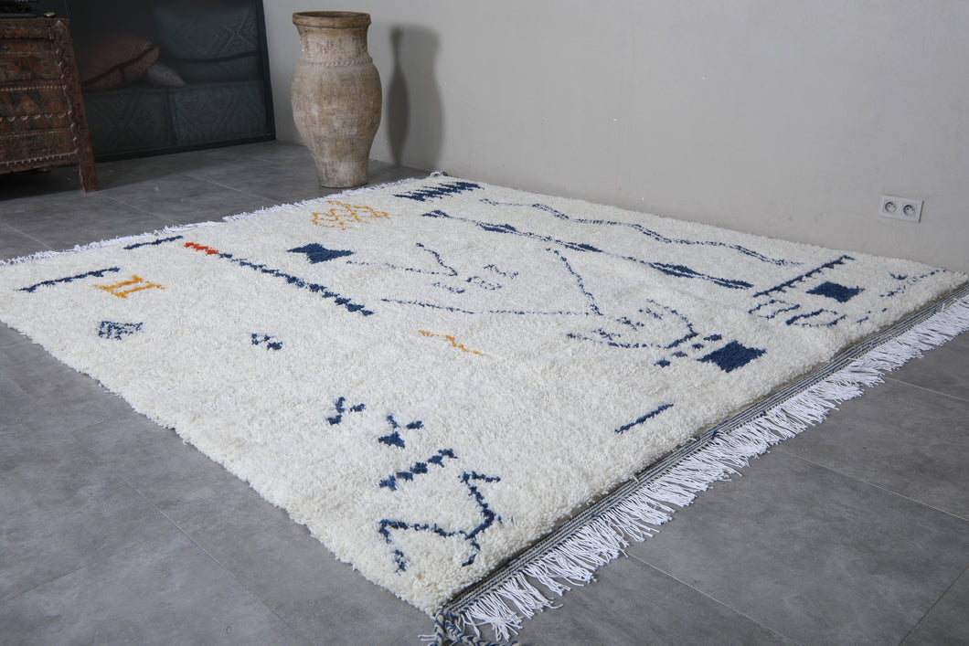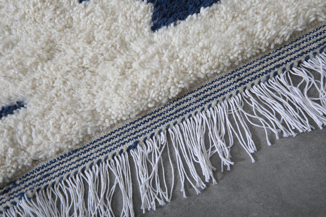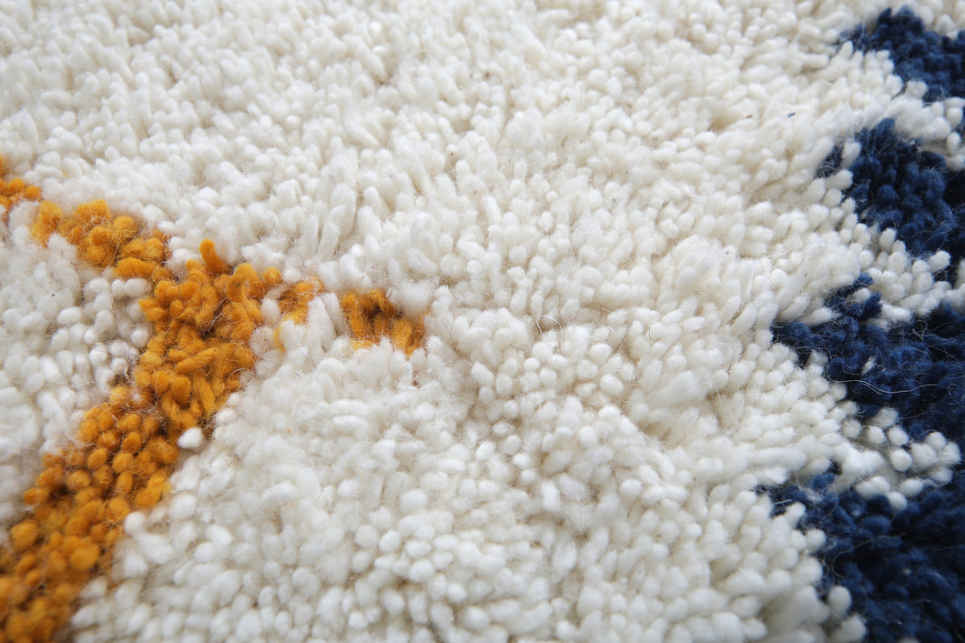 Elevate your living space with this Handmade Azilal Berber Rug, a unique Moroccan wool carpet featuring intricate geometric patterns in navy blue, gold, and red. Skillfully crafted by Moroccan artisans, this one-of-a-kind piece combines tradition and modern artistry, making it ideal for bohemian, contemporary, or eclectic interiors. Soft, durable, and ethically made, this rug adds warmth, texture, and cultural charm to any room.