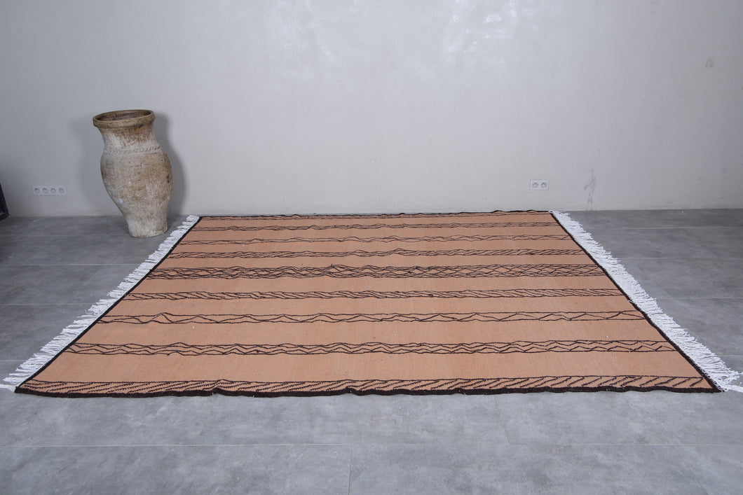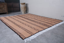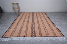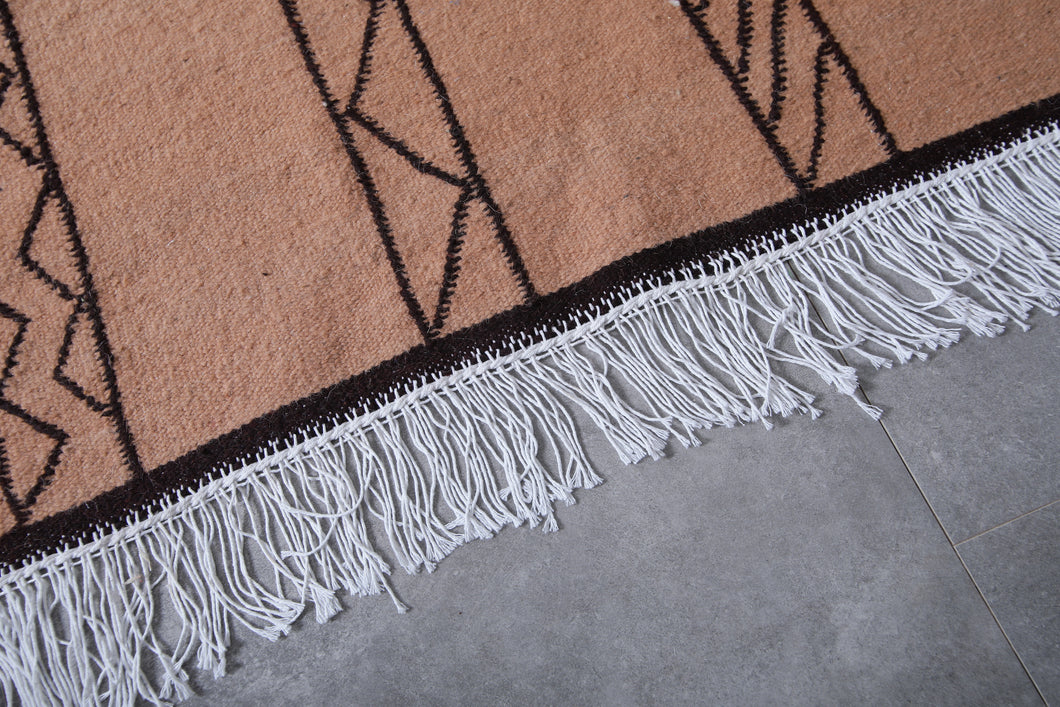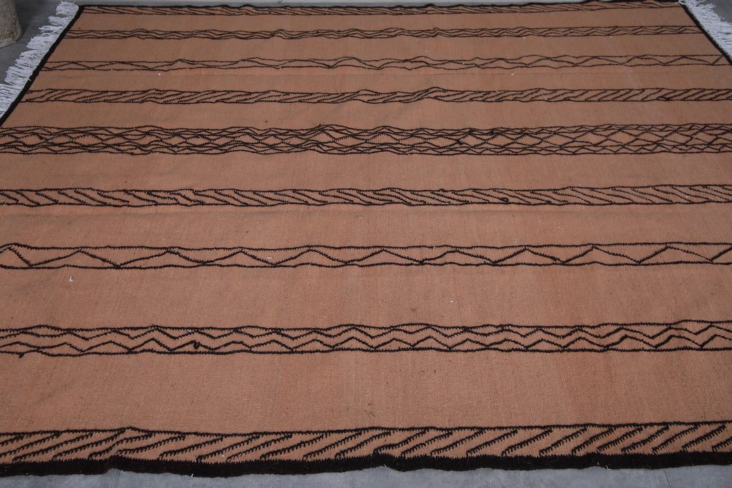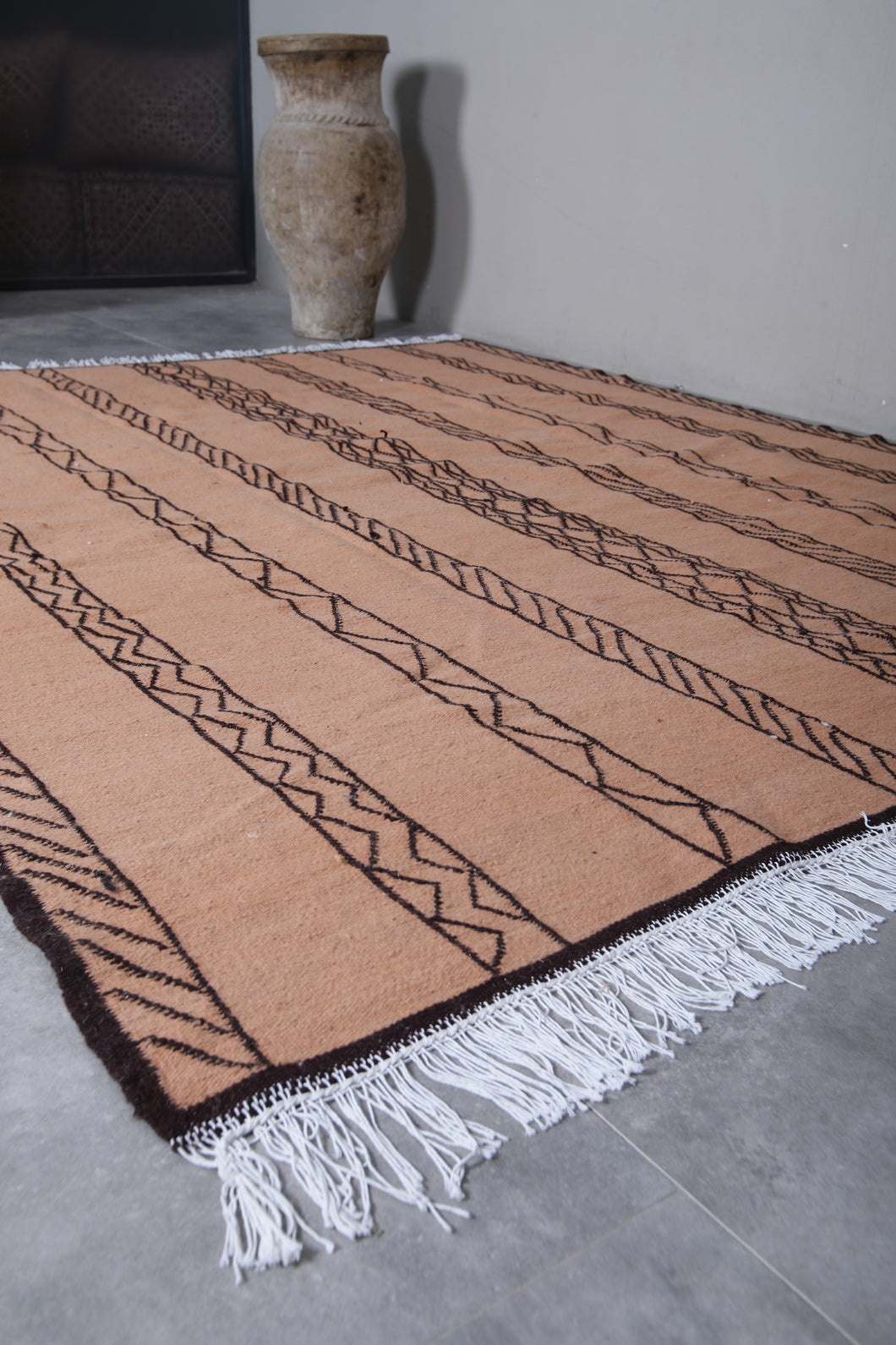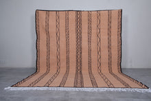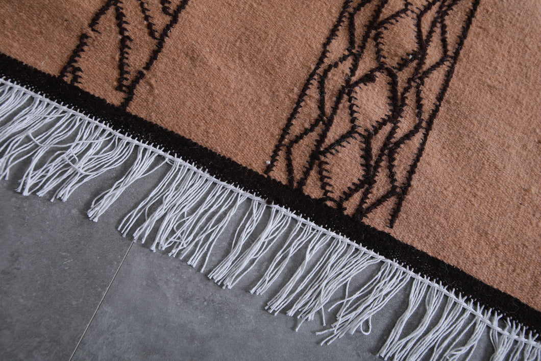 This stunning Moroccan rug features a warm brown base adorned with bold black stripes and intricate Berber patterns, bringing an elegant and earthy vibe to your decor. Skillfully handwoven by artisans, it reflects traditional craftsmanship with a contemporary flair. Ideal for modern and bohemian interiors, this versatile piece adds texture and character to any space. Made from durable, high-quality materials, it ensures longevity and comfort. Customizable to fit your size preferences, this rug is perfect for elevating your living space with a touch of Moroccan heritage.