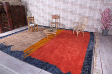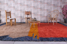 Transform your space with this vibrant Moroccan Berber rug, a true piece of art for your floor. Featuring a striking color-block design in rich red, gold, beige, and blue, this handmade rug brings warmth and character to any room. Carefully crafted by skilled Moroccan artisans, the rug is made from premium natural wool for a luxurious and soft texture.