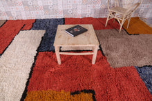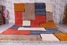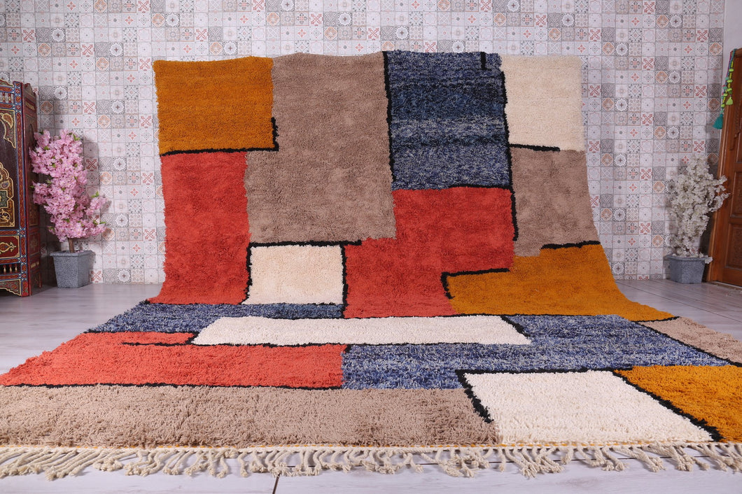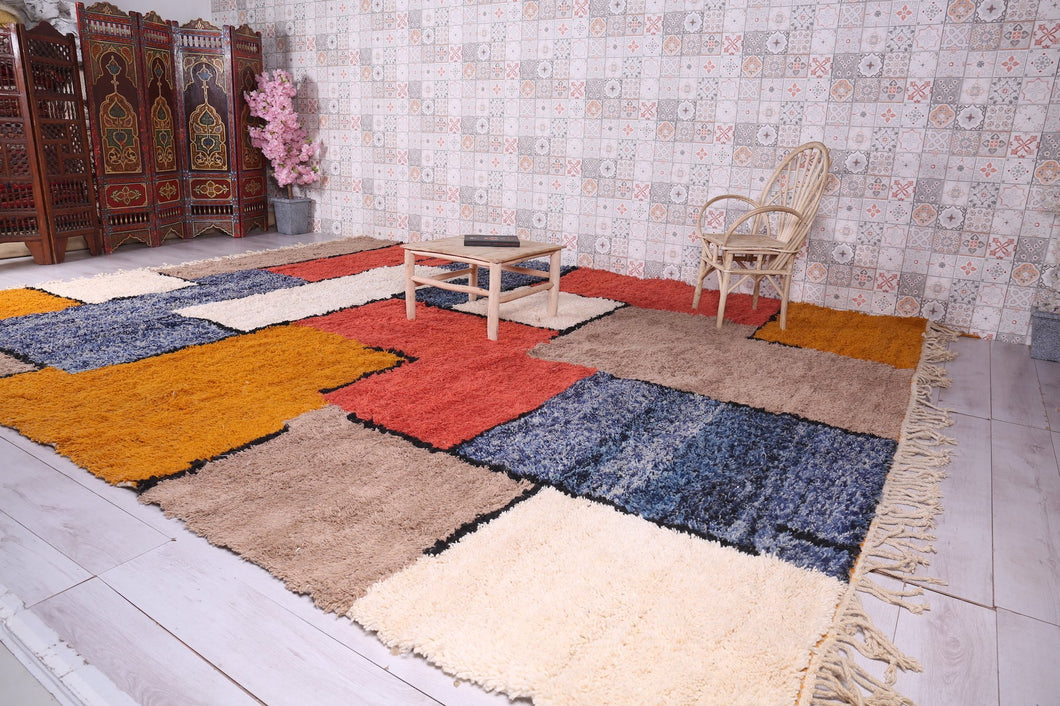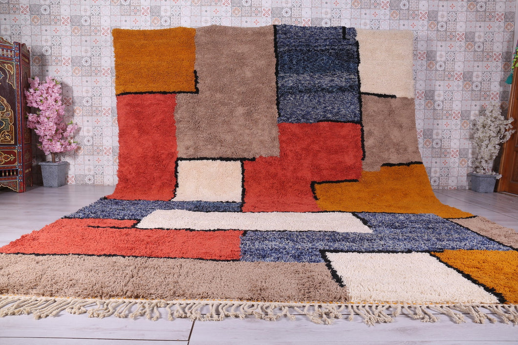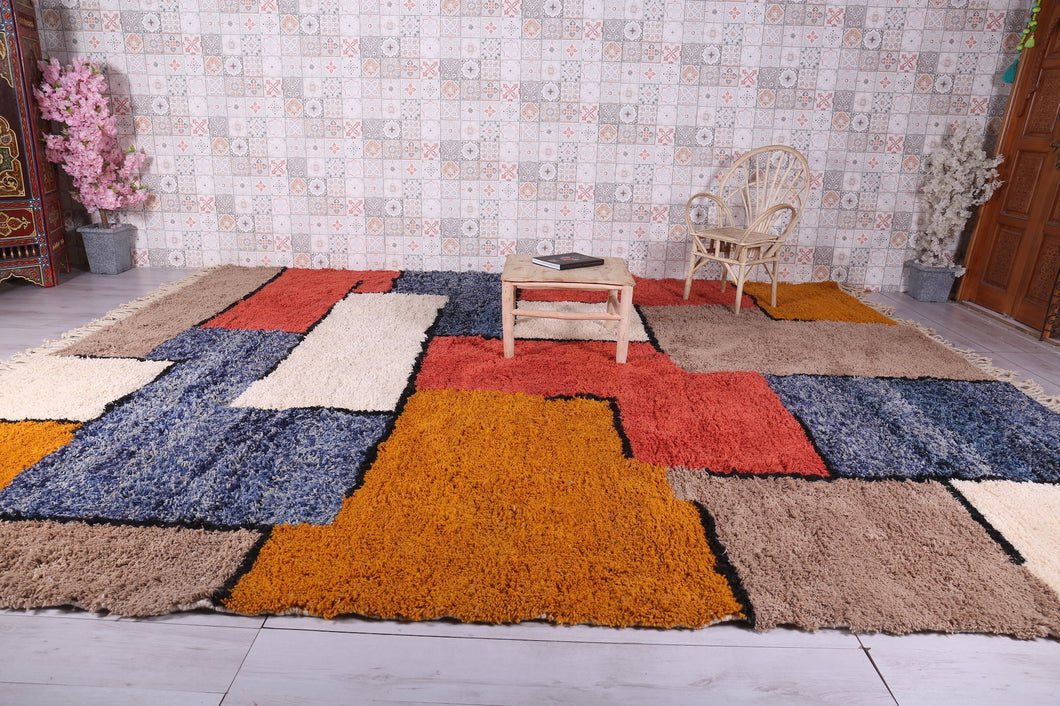 Transform your living space with this Colorful Moroccan Rug, a vibrant handmade masterpiece that combines tradition with modern design. Crafted by skilled Berber artisans using 100% natural wool, this rug features a stunning patchwork of warm earthy tones—red, orange, blue, beige, and white. Each block is separated by bold black lines, creating a dynamic geometric design that adds character and charm to any room.
