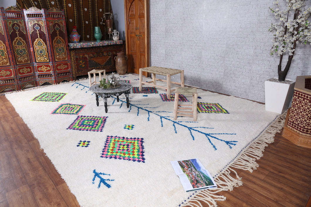Enhance your home with this custom handmade Azilal rug, a true reflection of Moroccan Berber artistry. Featuring a vibrant blend of geometric patterns and colorful designs, this one-of-a-kind rug is crafted from premium wool for a soft and durable texture. Perfect for adding a touch of culture and uniqueness to any room, its intricate details make it a captivating centerpiece. Ideal for living spaces, bedrooms, or offices, this Azilal rug combines tradition with contemporary elegance. Customize the size to suit your space and style effortlessly.