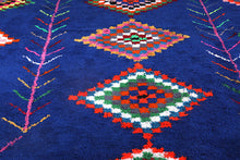 Elevate your home decor with this custom handmade Berber rug, a vibrant blue Moroccan Azilal carpet showcasing intricate geometric patterns. Crafted from premium wool, this unique rug merges traditional artistry with bold, lively colors, creating a captivating centerpiece for any space. Its soft texture offers comfort underfoot, while its durable craftsmanship ensures long-lasting use. Ideal for adding warmth and a splash of cultural charm to living rooms, bedrooms, or eclectic interiors. Bring Moroccan heritage into your home with this stunning Azilal rug.