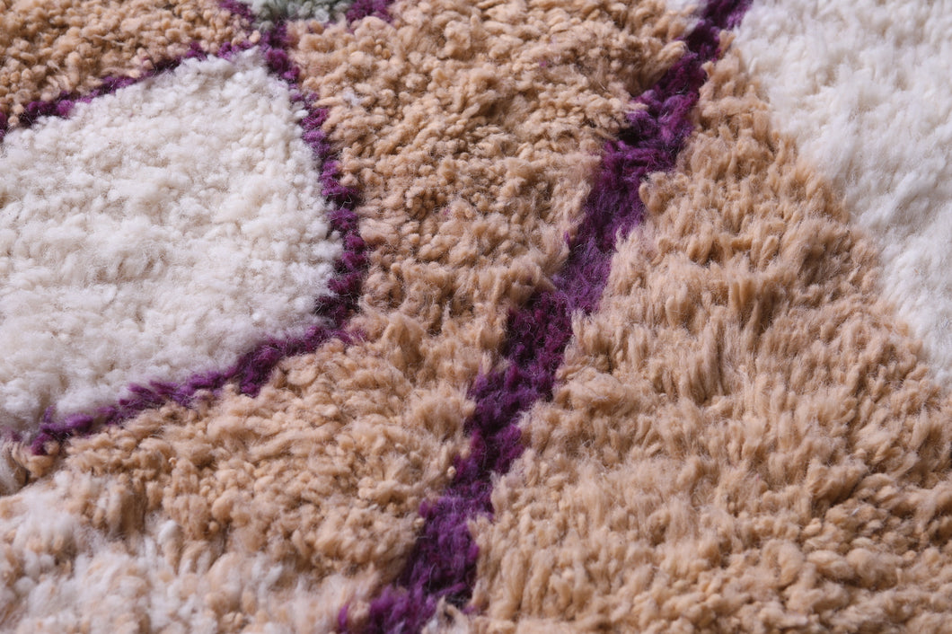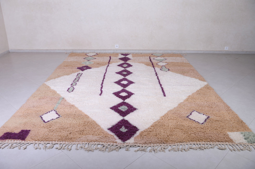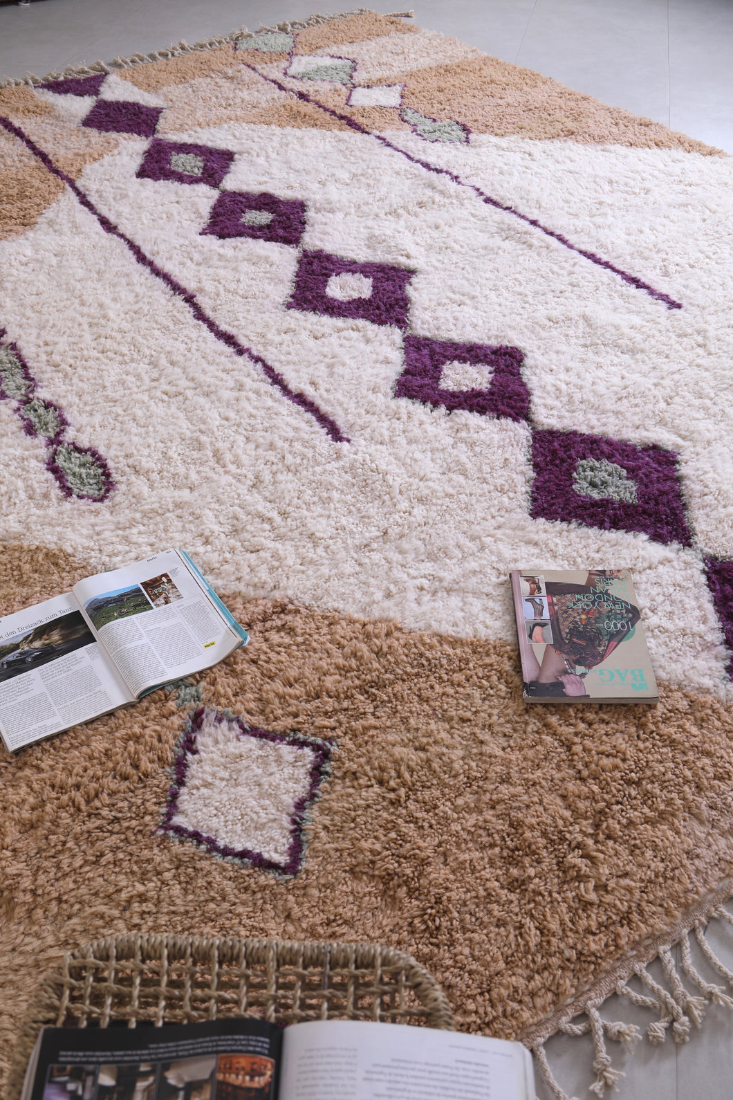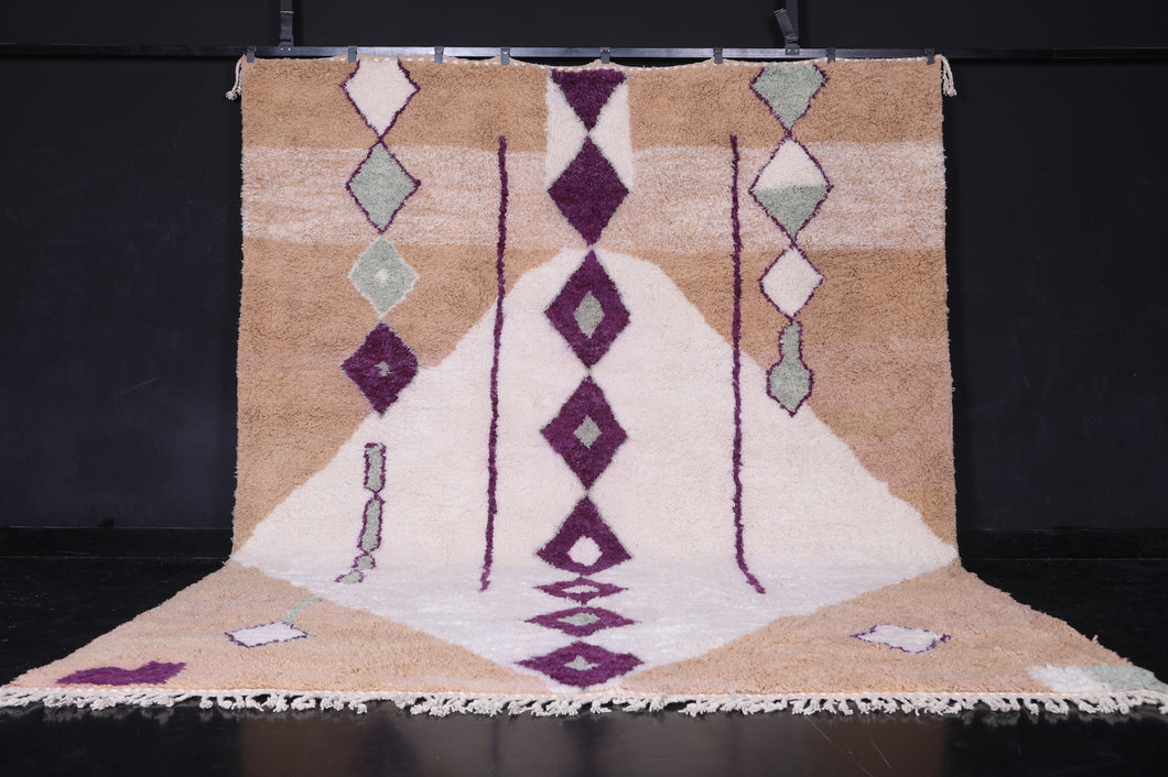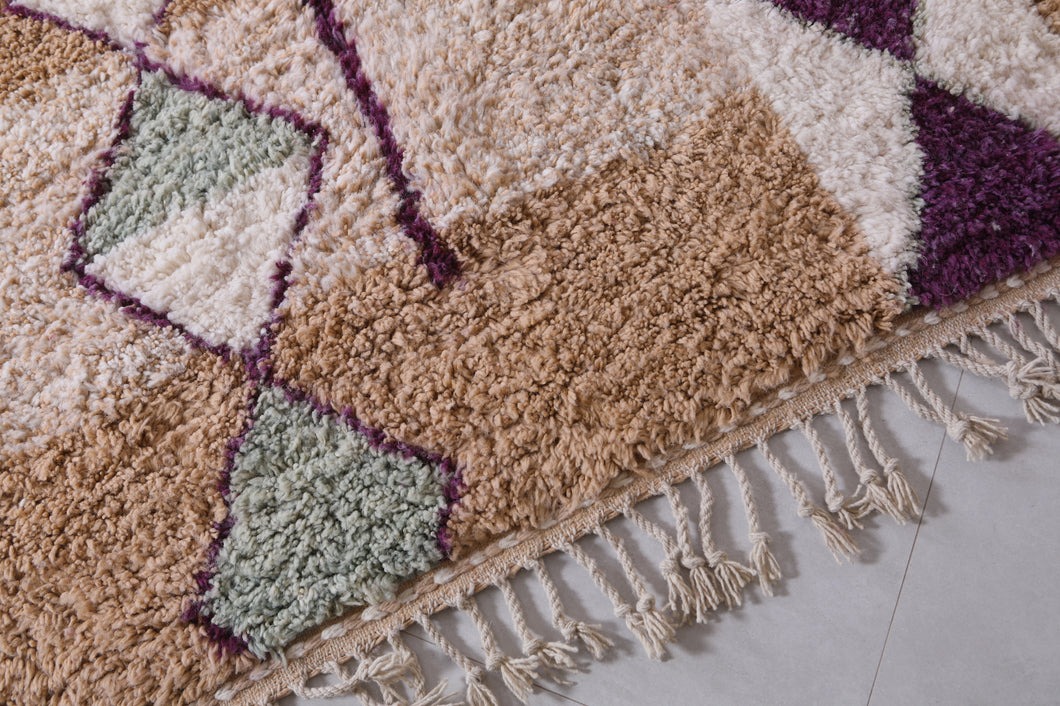 Enhance your home decor with this unique handmade Moroccan rug, featuring a stunning geometric design in warm earthy tones, accented with purple and mint green. Made from high-quality wool, this custom area rug is soft, durable, and perfect for creating a cozy atmosphere in your living room, bedroom, or office. Its intricate patterns and vibrant colors add a modern yet traditional touch to any space. Available in various sizes to suit your needs.