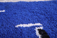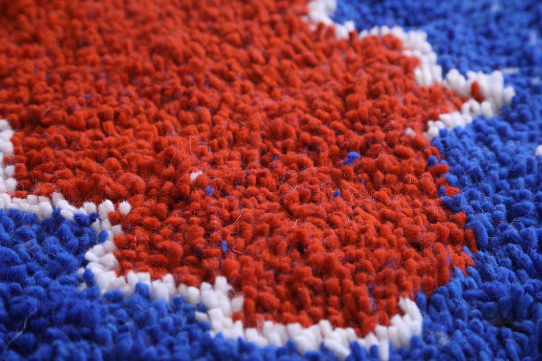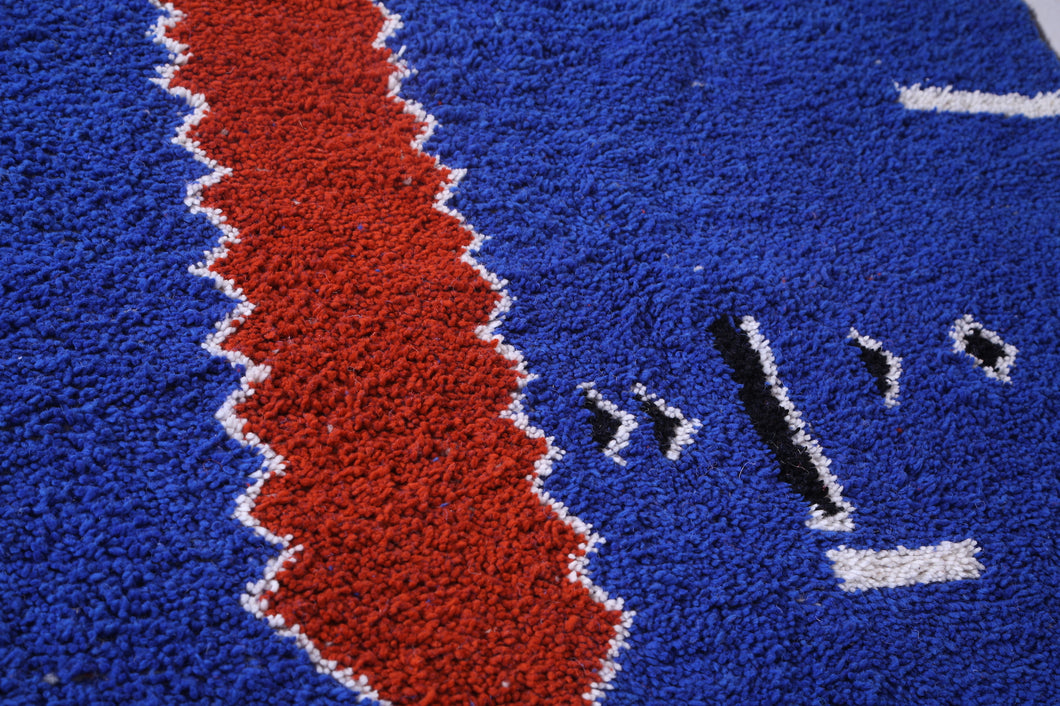 Add a bold and artistic touch to your home with this Moroccan Berber Rug. Featuring a vibrant blue backdrop accented by striking red and white geometric patterns, this handmade wool carpet is a testament to the craftsmanship of Berber artisans. Its unique design, inspired by Moroccan culture, is perfect for making a statement in living rooms, bedrooms, or offices. Made from 100% natural wool, this rug provides unmatched warmth, softness, and durability. Customizable in size, it seamlessly blends traditional artistry with modern decor styles.