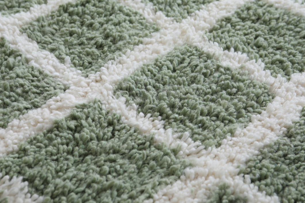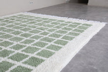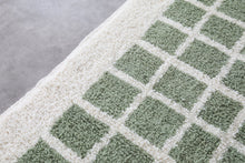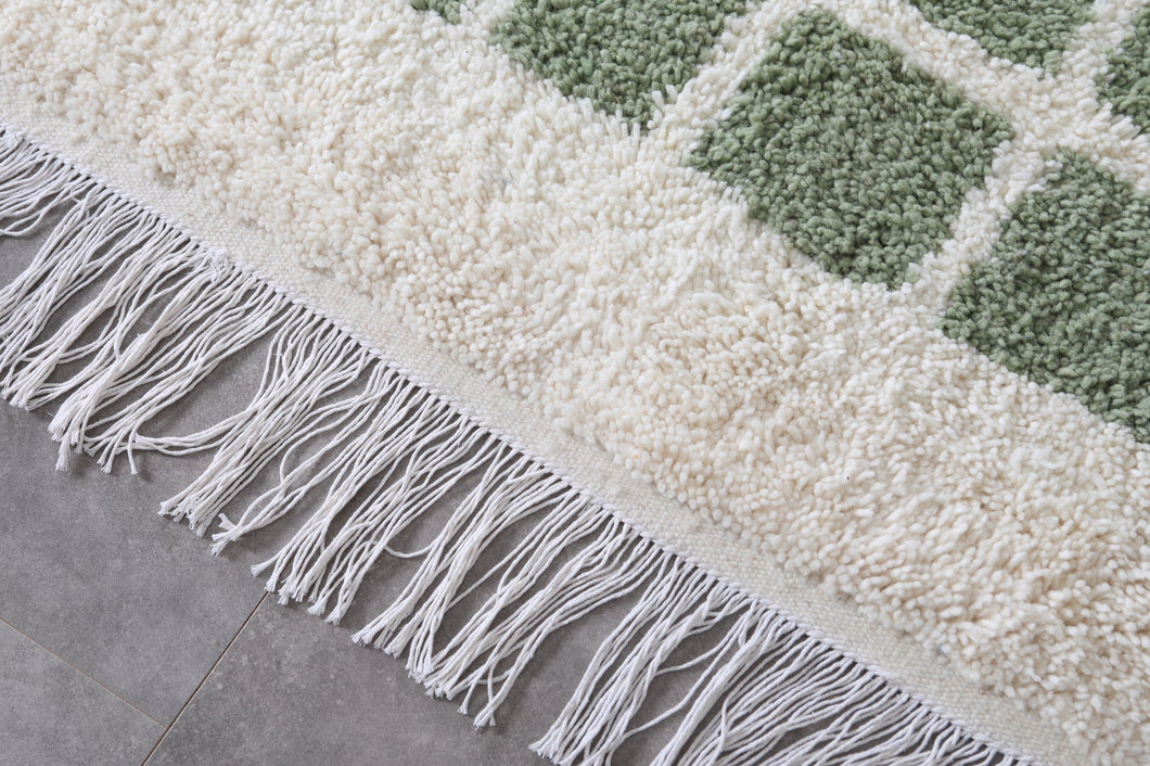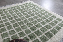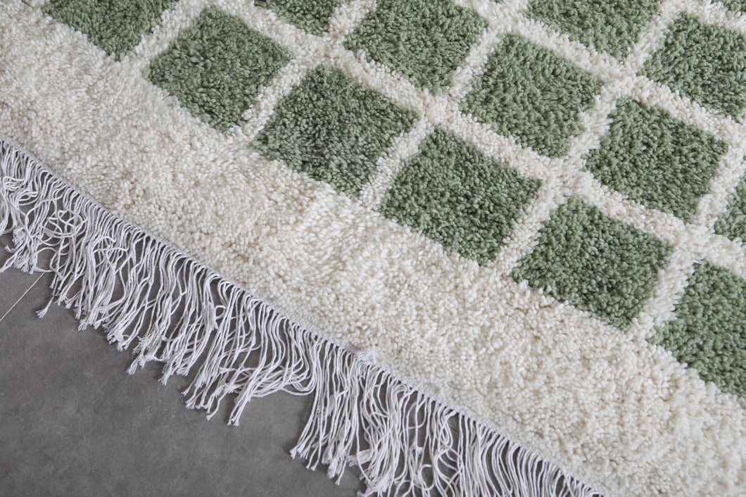 Transform your space with this stunning Moroccan green rug featuring a bold square pattern. Handcrafted by skilled artisans, this custom-made carpet combines intricate design with luxurious texture, adding a modern yet timeless touch to your home. The harmonious blend of soft green and white hues complements various decor styles, from minimalist to bohemian. Made with premium wool, this rug offers durability and comfort, perfect for any room in your house. Available in customizable sizes for a seamless fit. Bring Moroccan craftsmanship into your home with this unique rug today!