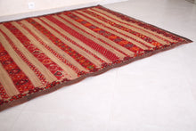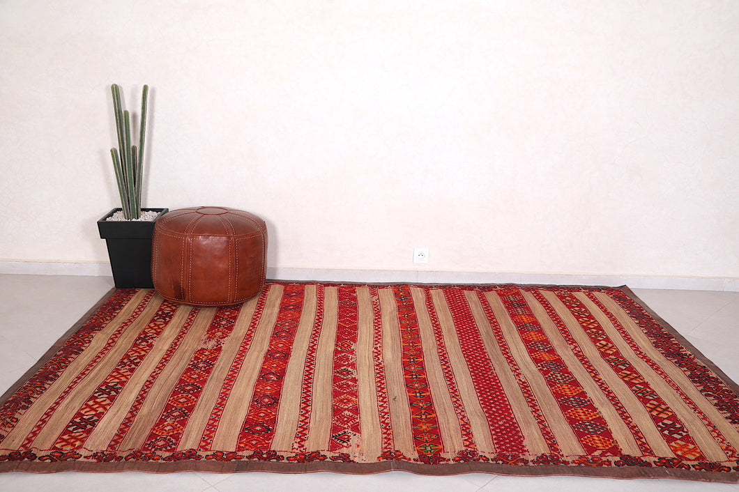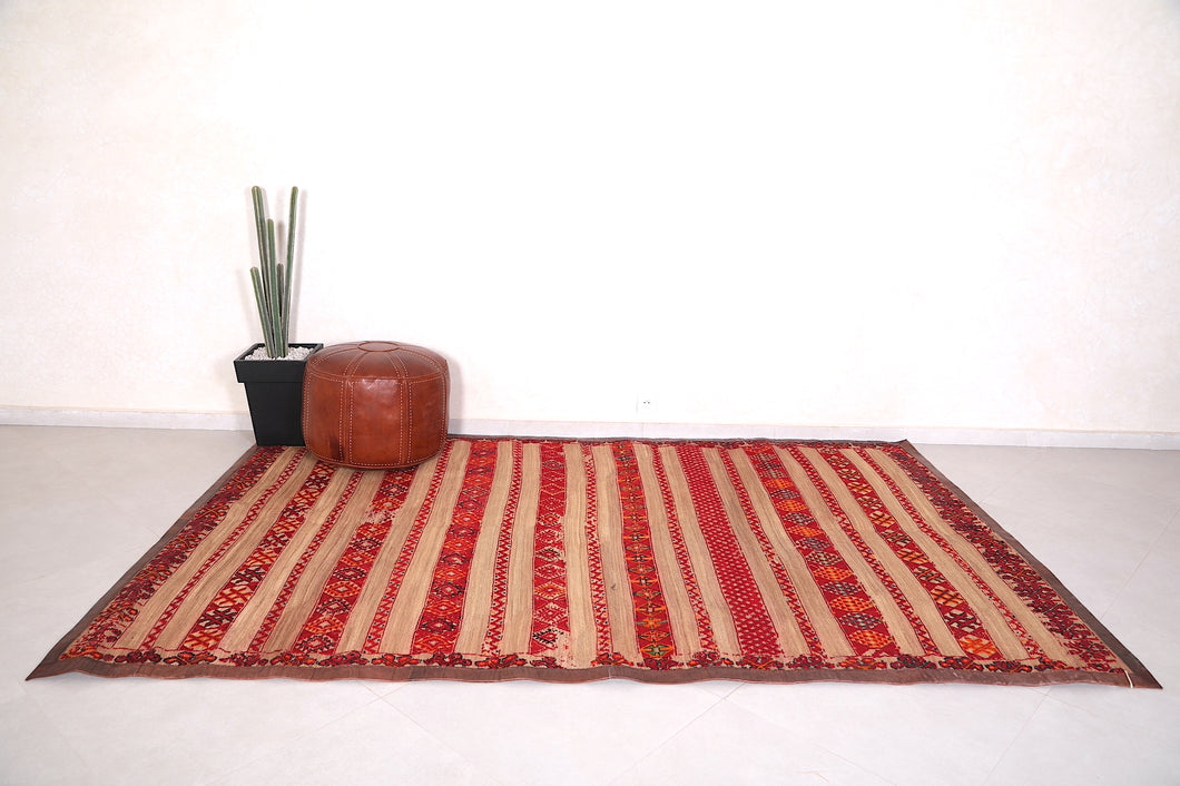 Elevate your interior with this beautiful Moroccan Hassira mat, measuring 6.1 FT X 9.6 FT. Its vibrant hues of red and beige with intricate geometric and tribal designs add warmth and sophistication to any room. This handcrafted piece is woven by skilled Moroccan artisans using traditional techniques, making it a unique addition to your home.