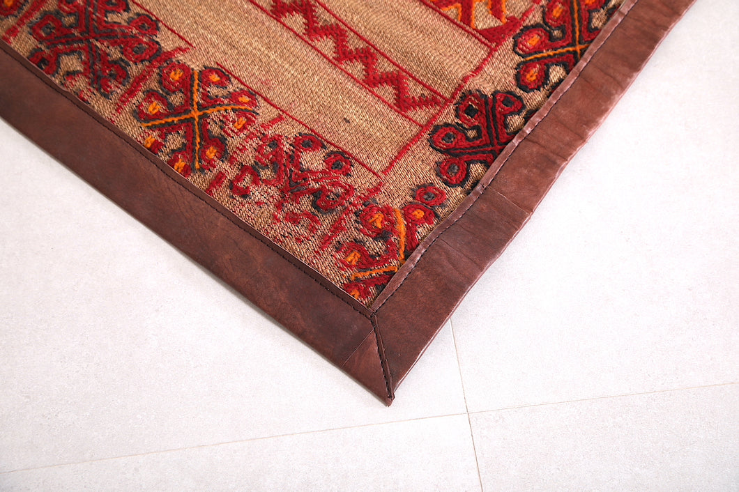 Crafted from durable natural fibers and finished with leather-trimmed edges, this rug combines authenticity and durability. Its versatile size makes it ideal for living rooms, dining areas, or bedrooms.