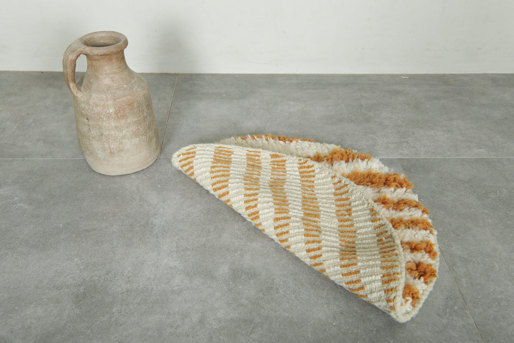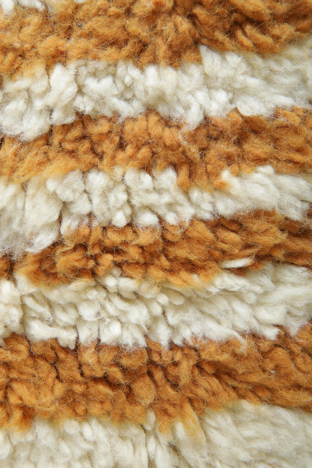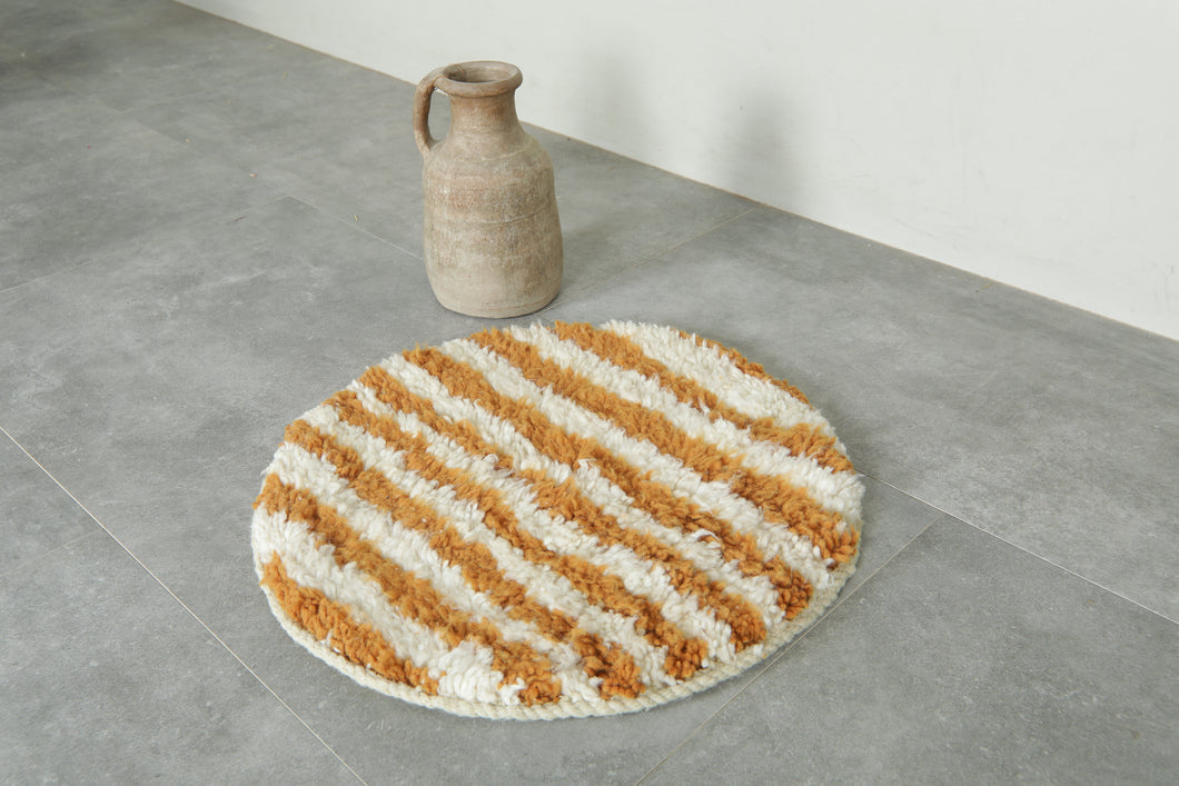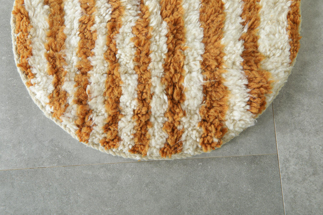 Bring a touch of timeless Moroccan artistry into your home with this custom round rug, carefully handwoven by skilled artisans in the heart of Morocco. Crafted from 100% premium wool, this stunning piece features a rich, calming orange and cream striped design — evoking the warmth and charm of traditional Moroccan textiles.