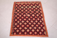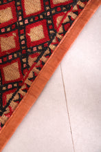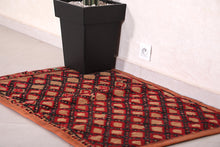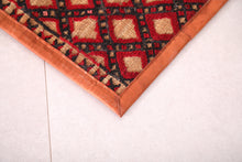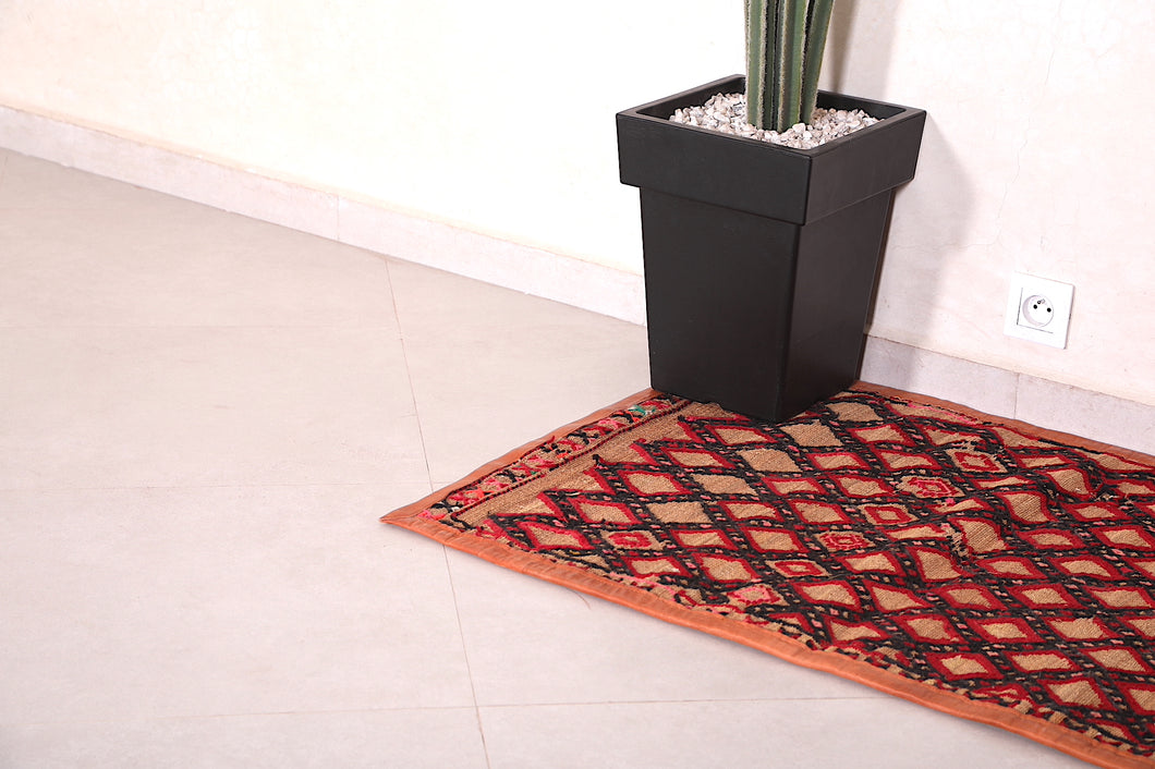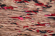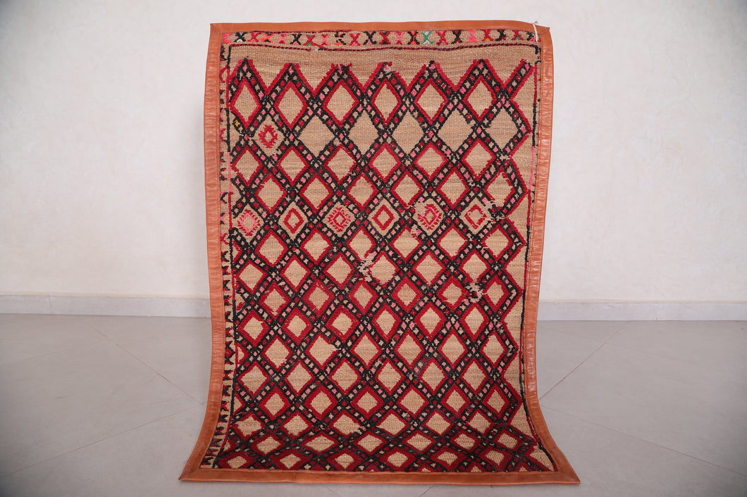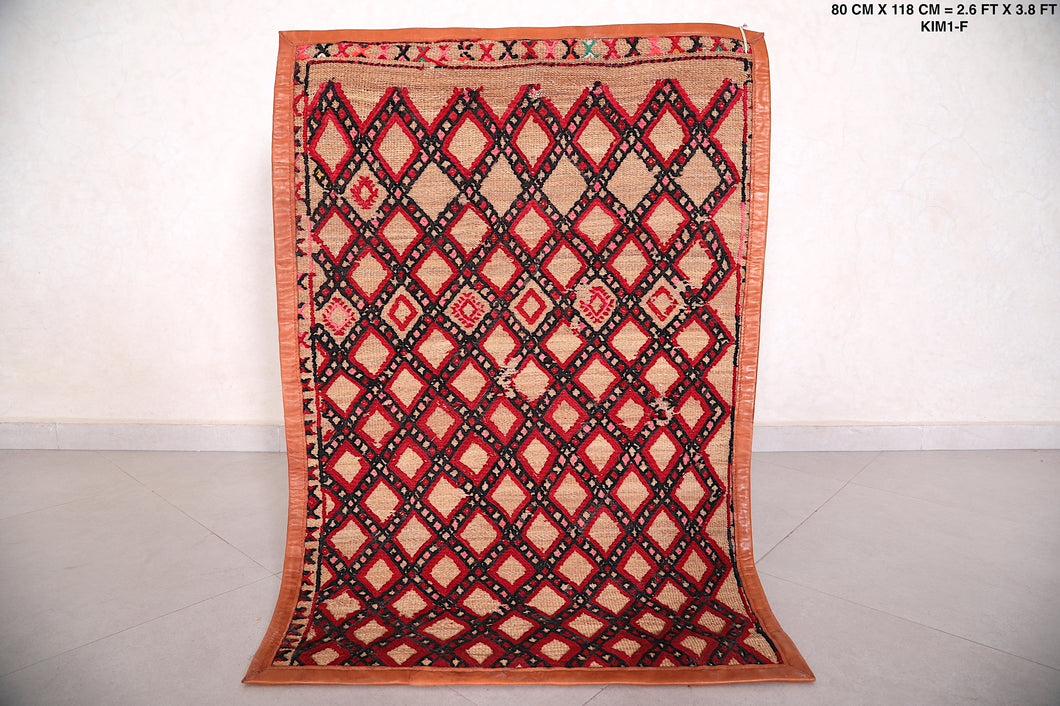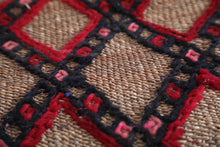 Elevate your space with the charm of this Moroccan Straw Mat, featuring a compact 2.6 FT X 3.8 FT design. Crafted with care, this handwoven mat combines natural straw with vibrant red and black diamond motifs, embodying the essence of Moroccan artistry. Its intricate design and durable material make it a versatile piece for use as a wall hanging, small area rug, or unique decorative accent.