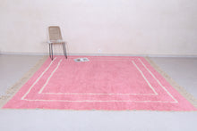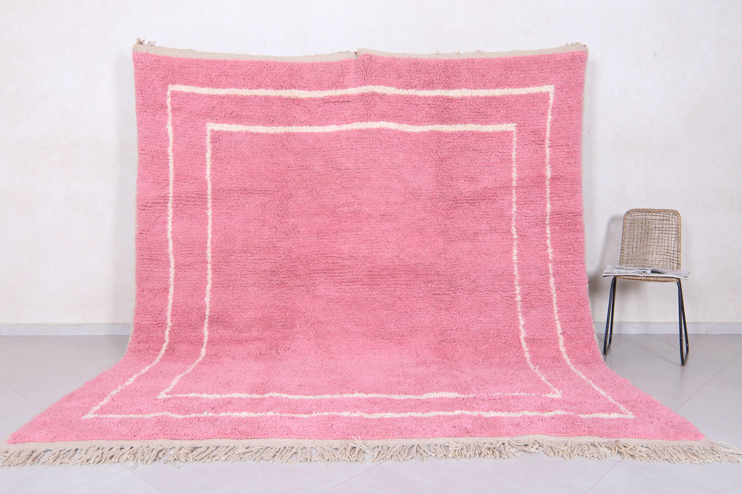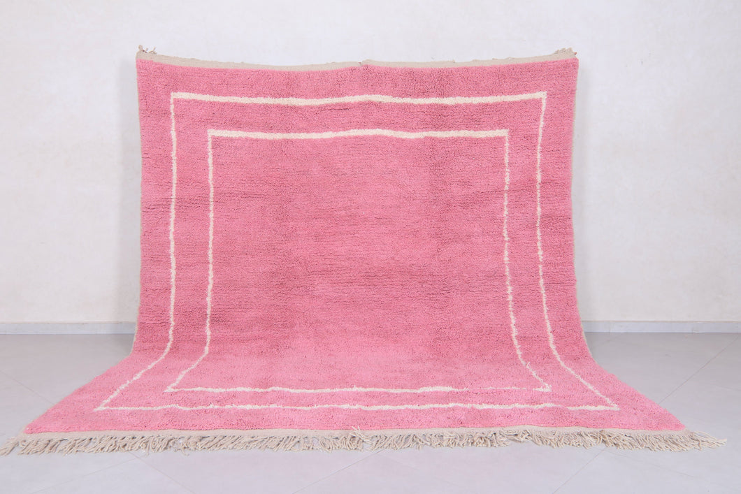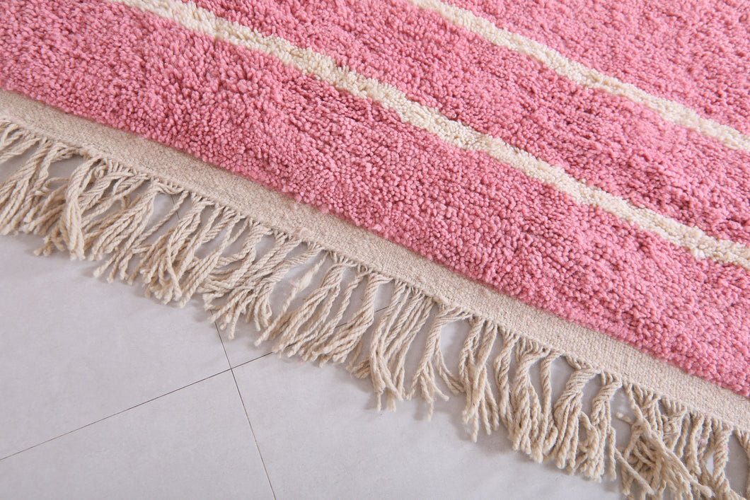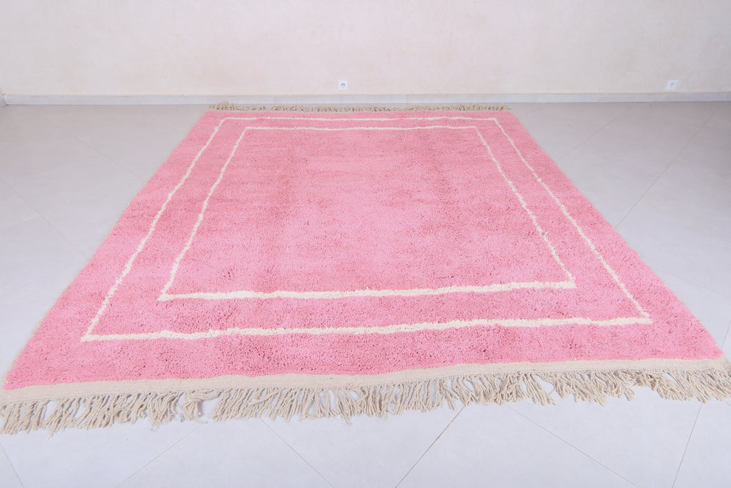 Add a touch of elegance to your home with this pink Moroccan area rug, handcrafted with care and precision. Featuring a minimalist design with soft pink tones and subtle white border accents, this rug blends seamlessly into modern, boho, or traditional interiors. Made with premium wool, it provides exceptional comfort, durability, and style. The fringed edges enhance its artisanal charm, making it an ideal centerpiece for your living room, bedroom, or workspace. Fully customizable in size to suit your unique space and decor needs.