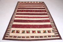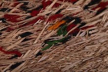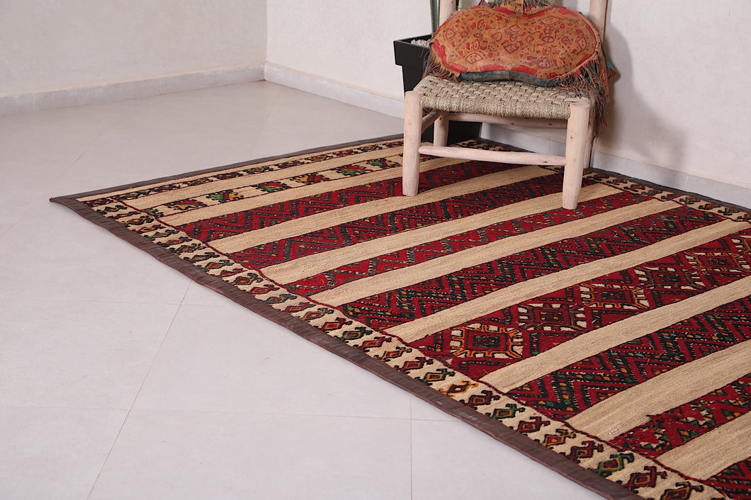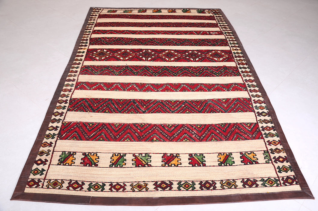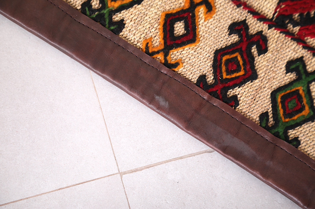 This Vintage Khemisset Straw Leather Mat, measuring 6 FT X 10 FT, is a stunning piece of Moroccan craftsmanship. Handwoven using natural straw and bordered with high-quality leather, it features intricate patterns and bold red, green, and earthy tones that bring a rustic charm to any space. The detailed geometric and floral designs showcase the rich heritage of Khemisset artistry, making it perfect for adding a touch of cultural elegance to your home or outdoor décor. Lightweight yet durable, this versatile mat is ideal for living rooms, patios, or events with a traditional aesthetic.
