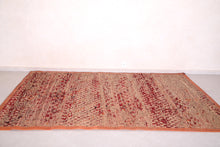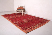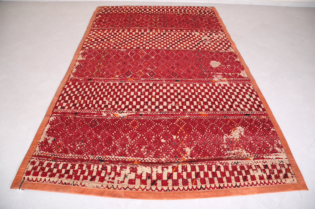 Introduce a piece of authentic Moroccan heritage into your home with this stunning vintage rug, measuring 5.9 FT X 9.7 FT. Crafted with a unique combination of wool and straw, this piece is adorned with intricate geometric patterns in deep reds and earthy tones. The handcrafted charm is complemented by a durable leather border for added longevity and an authentic touch.